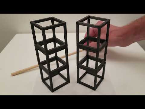 „Author description: In the “Tower of Cubes?” illusion, the viewer is shown a stack or tower created with three perfect, 3D-printed cubes on the left beside a tower on the right. Once assembled a straight wooden stick is driven through the left tower from the top to bottom. The stick is likewise pushed through the tower of cubes on the right but now appears to bend around the structure in a surprising and impossible manner. The illusion is resolved by disassembling the tower on the right revealing warped 3D-printed cubes that are anything but perfect.“