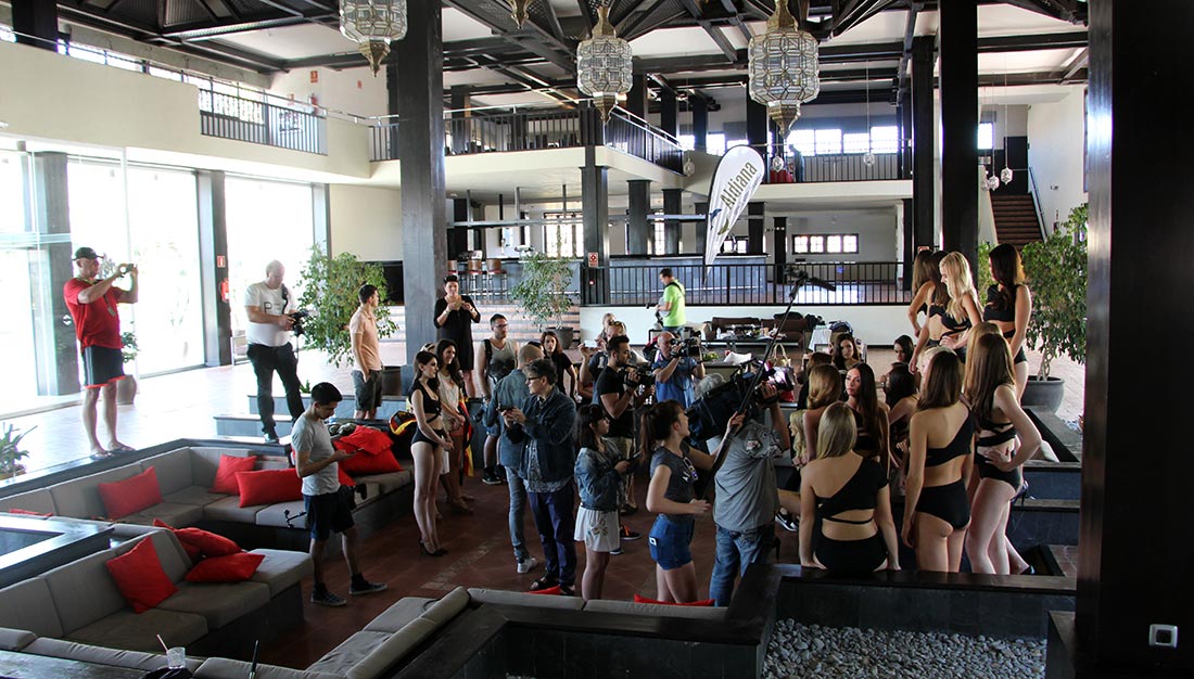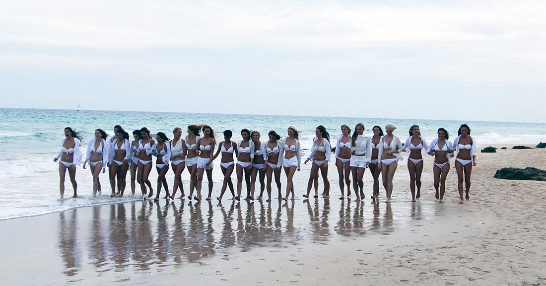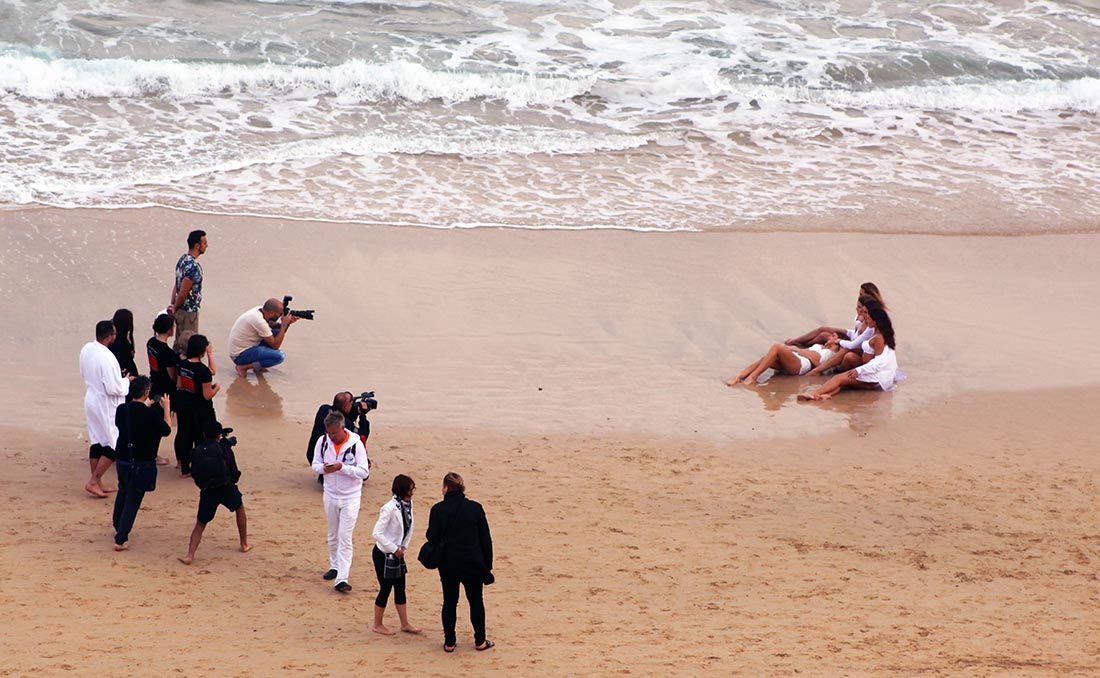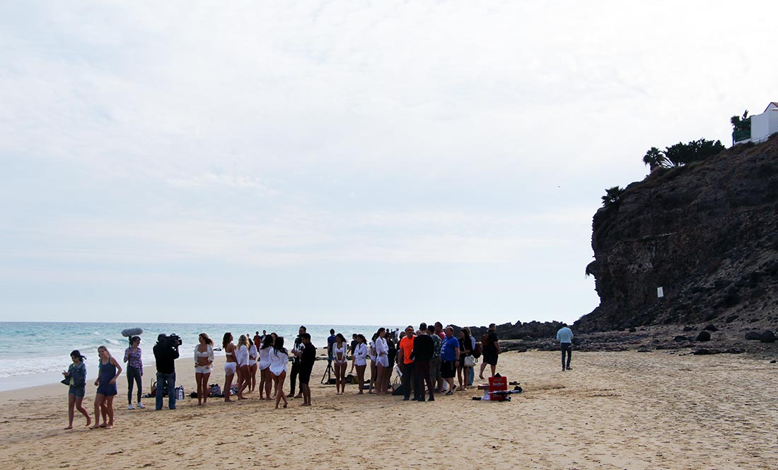Dann ging es endlich zum Strand! In großer Gruppe, inklusive ständig umschwirrender Kamera-Drohne. Schöne Kulisse, schöne Missen – könnte schlimmer sein.