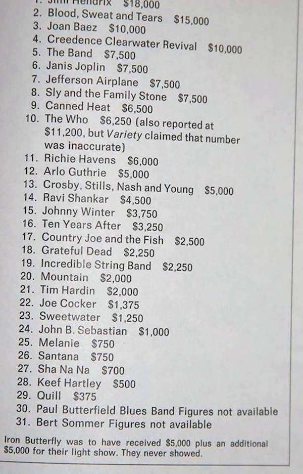 Wie sehr sich dank Inflation und Boom der Musik-Wirtschaft inkl. Star-Hype eine solche Summe verändern kann, zeigt diese aktuell im Web herum gereichte Liste mit den angeblichen Booking-Kosten der Acts des legendären Woodstock Festivals 1969. Da war ein Topverdiener namens Jimmy Hendrix mit sagenhaften 18.000 Dollar am Start. Okay, das waren damals auch immerhin 65.880 DM, gehen wir von einer Inflationsrate von 2% p.a. aus, landen wir bei 163.818 DM, also stattliche 83.759 Euro. Immerhin.