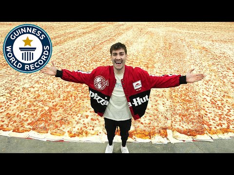 „YouTube star Airrack (USA) teamed up with Pizza Hut up to make the world’s largest pizza and grab a slice of history – a colossal 13,990 square feet (1296.722 square metres). Their ambitious cooking project blew the previous record of 13,580.27 square feet (1,261.65 m²) away.“