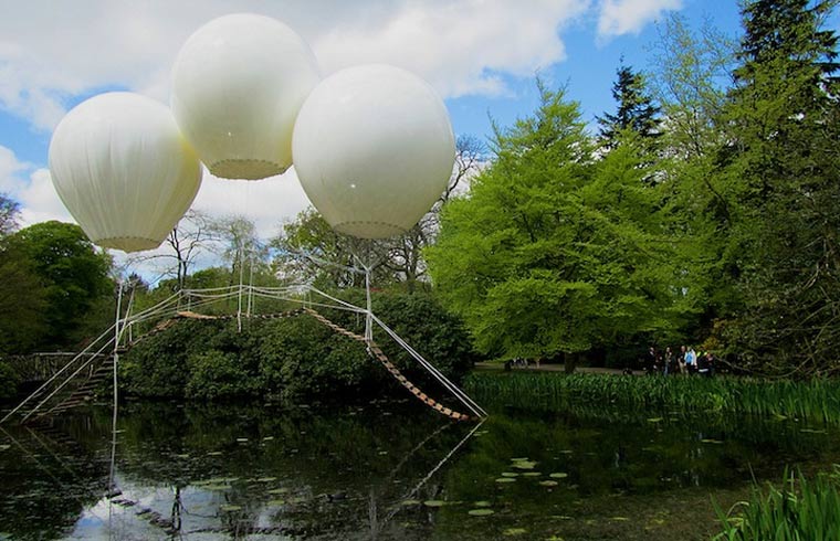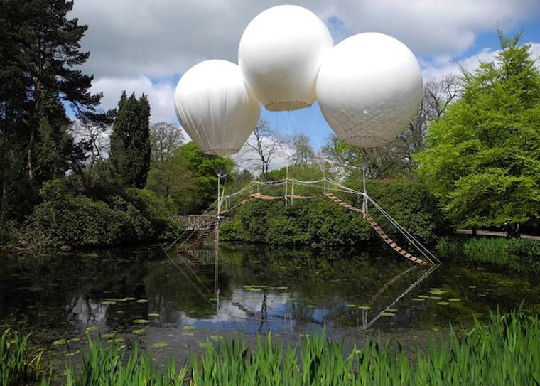 Im englischen Tatton Park, genauer gesagt dem japanischen Garten, steht dieses künstlerische Brückengebilde. Erdacht und erstellt vom französischen Künstler Olivier Grossetete wird das Leichtgewicht von drei riesigen Ballons in der Luft gehalten. Zwar nicht für die Begehung gedacht, aber definitiv ist die Brücke, die auf den Namen Pont de Singe hört, ein sehr schöner Anblick.