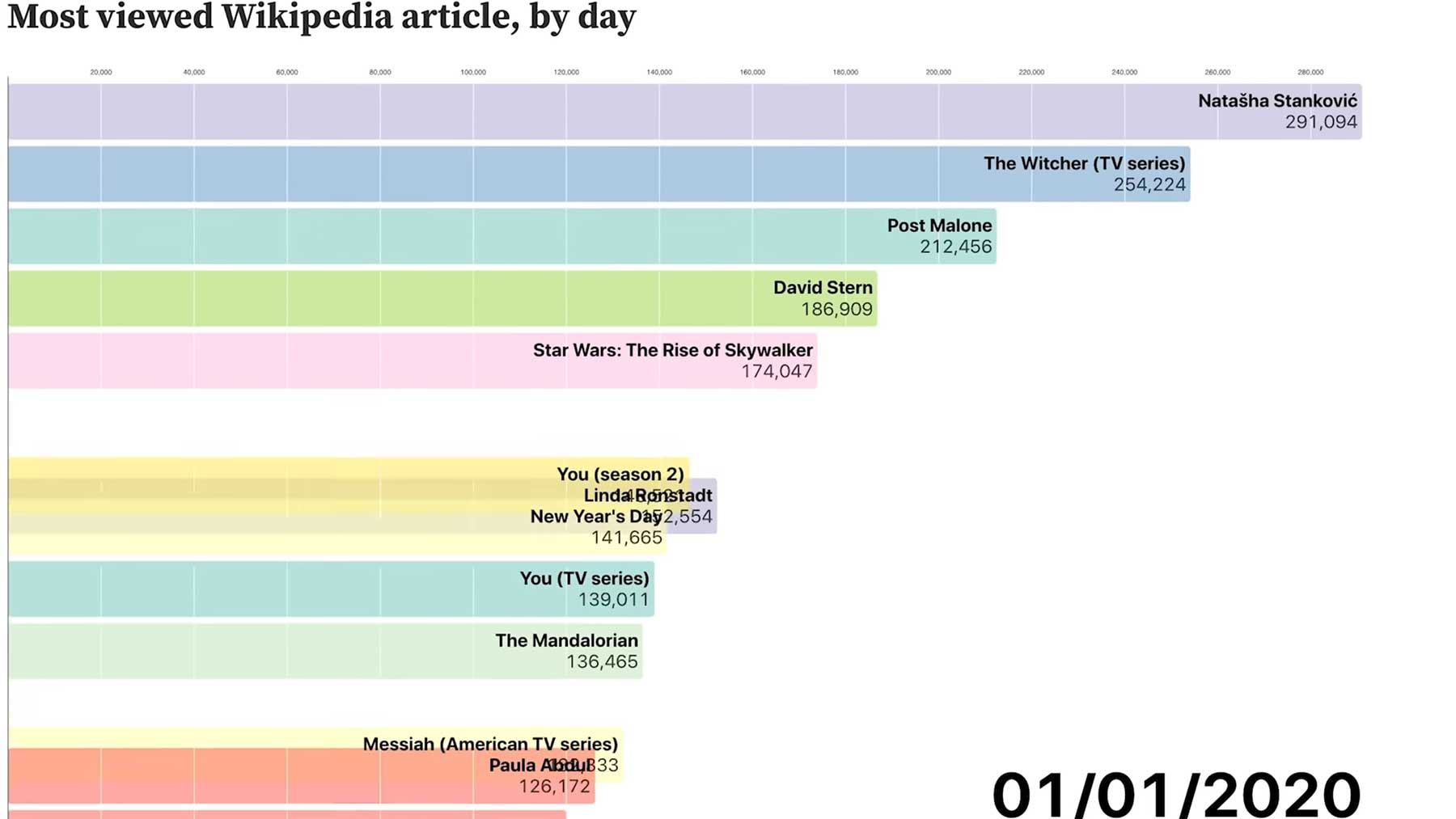 Haben mit zum Beispiel „The Witcher“ oder „Dracula“ zu Beginn des Jahres noch triviale Fernsehserien in den Top 10 der Wikipedia-Artikel gehaust, die am meisten aufgerufen worden sind, so hat sich die Lage dann doch recht fix relativiert und vor allem drastisch verfinstert. vastava demonstriert mit dieser datenanalytischen Balkenjagd, wie schnell der Coronavirus das Zepter übernommen hat. Aber auch Promi-Tode haben für ordentlich Wirbel gesorgt. Eine interessante Form des (Halb-)Jahresrückblickes.
