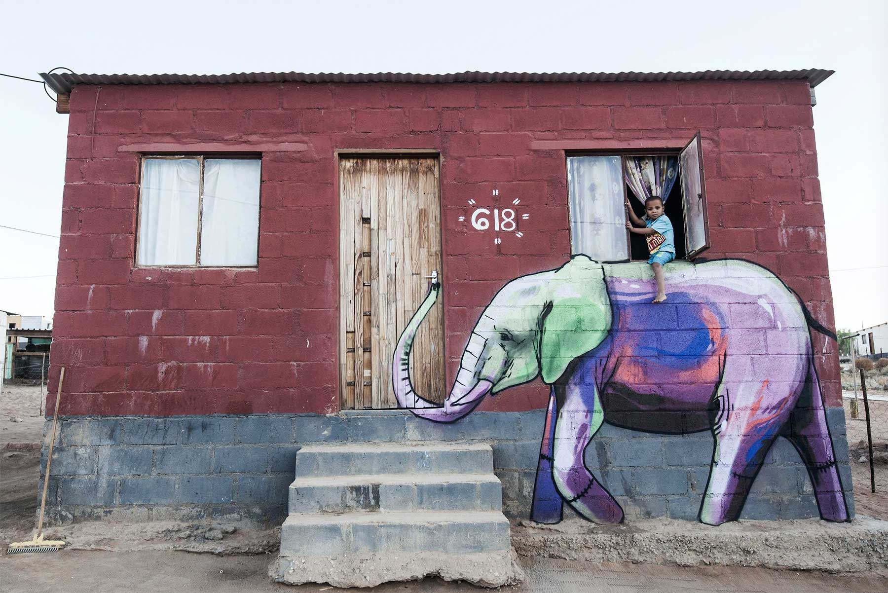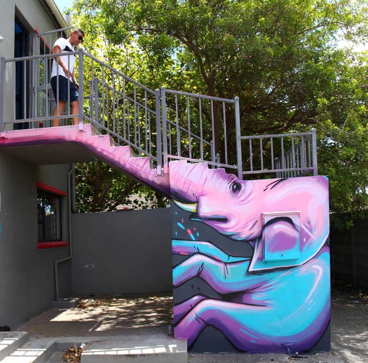 Ich liebe es ja, wenn Street Art nicht einfach „nur“ auf der Straße platziert ist, sondern die Umgebung mit einbezieht. Auf perspektivisch gelungene Art und Weise erweitert der in Kapstadt lebende Street Artist Falko One seine Motive mit Bauwerken, Gegenständen und vor allem Fantasie. Dabei zeigt er eine Vorliege für das Abbilden von Tieren, allen voran Elefanten. Hier eine kleine Auswahl einiger meiner Meinung nach besten seiner bisherigen Arbeiten aus dem Online-Portfolio von Falko One.