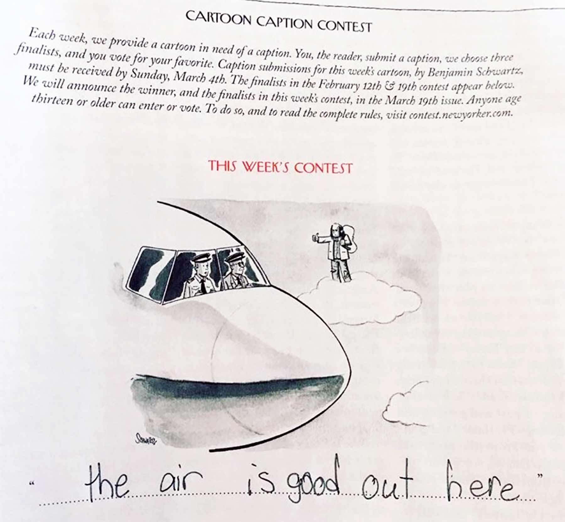 Beim Wettbewerb des New Yorker muss man allerdings mindestens 13 Jahre alt sein, so dass die kleine Alice noch ein paar Jahre abwarten muss (oder die Konkurrenz bis dahin ein bisschen trainieren…).