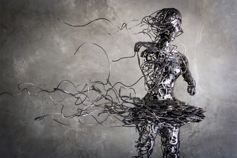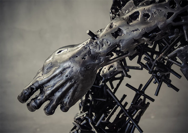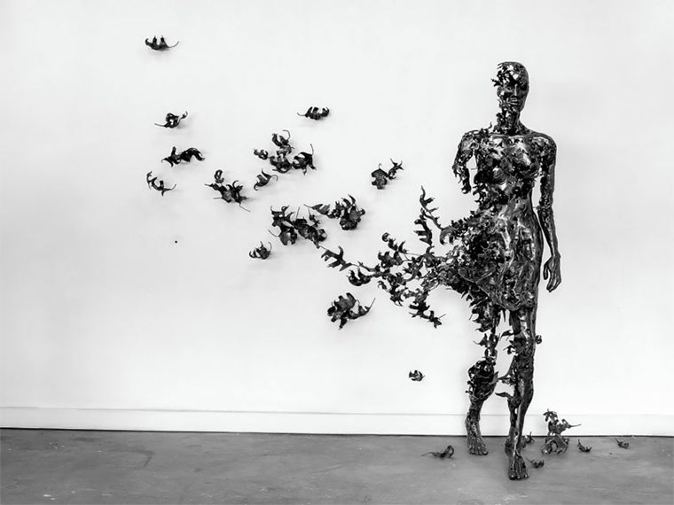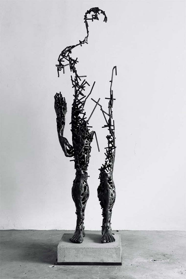 „The sculptures are metaphors for not only the vulnerability of one’s physical body but also one’s emotional and mental state. I used steel as a medium which is usually associated with the impression of unmoving strength. I sculpted each figure in a way that creates the notion that they are incomplete, melting or being pulled apart, deconstructed by a force either from within or without.“