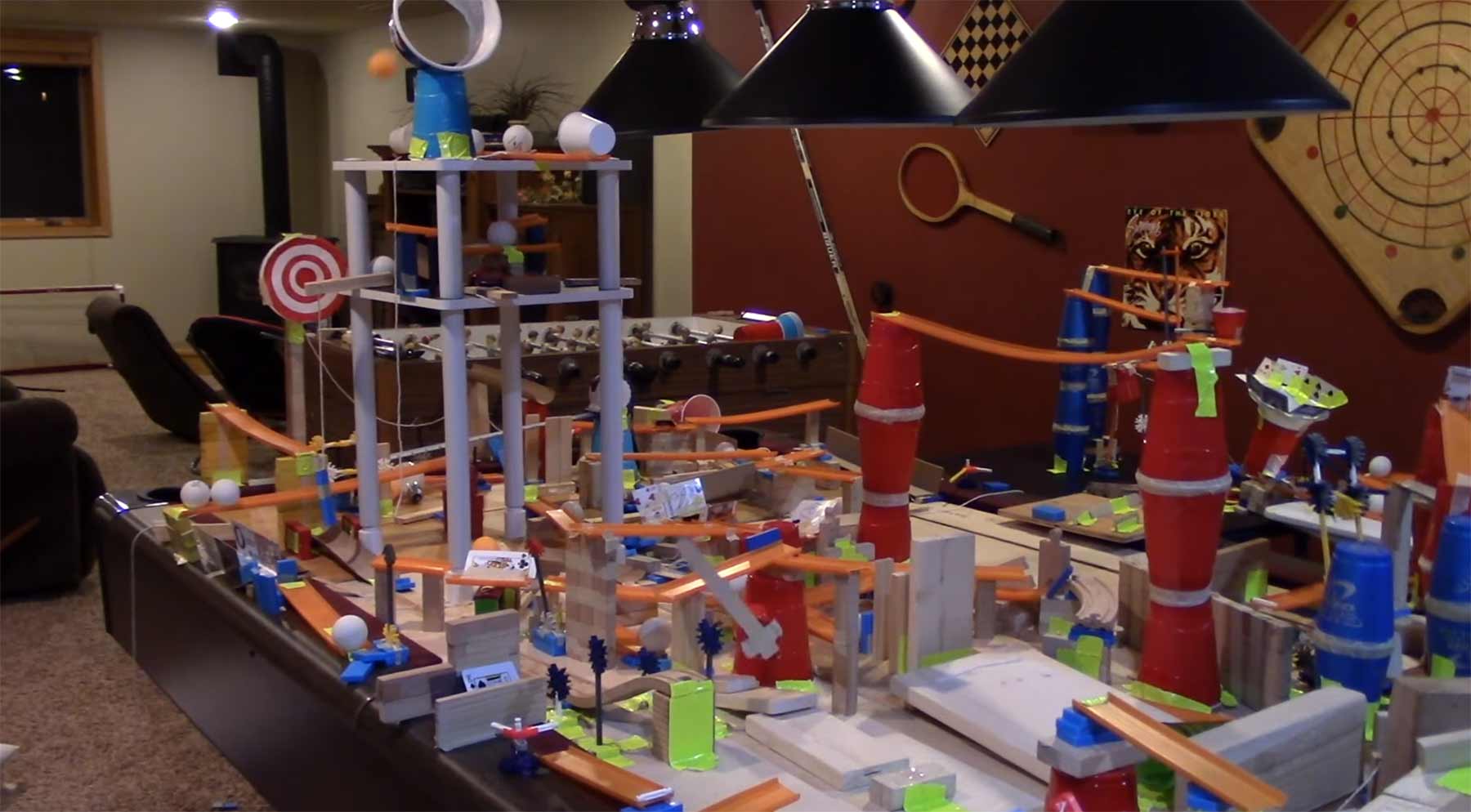 Rund 200 Einzelschritte vollzieht diese Rube Goldberg Machine von DaksDominos, bis der überschaubare Nutzen eines Klebestreifen-Abrollens eintritt. In den etwa fünf Minuten kann man sich ja parallel einen Tee kochen oder so.