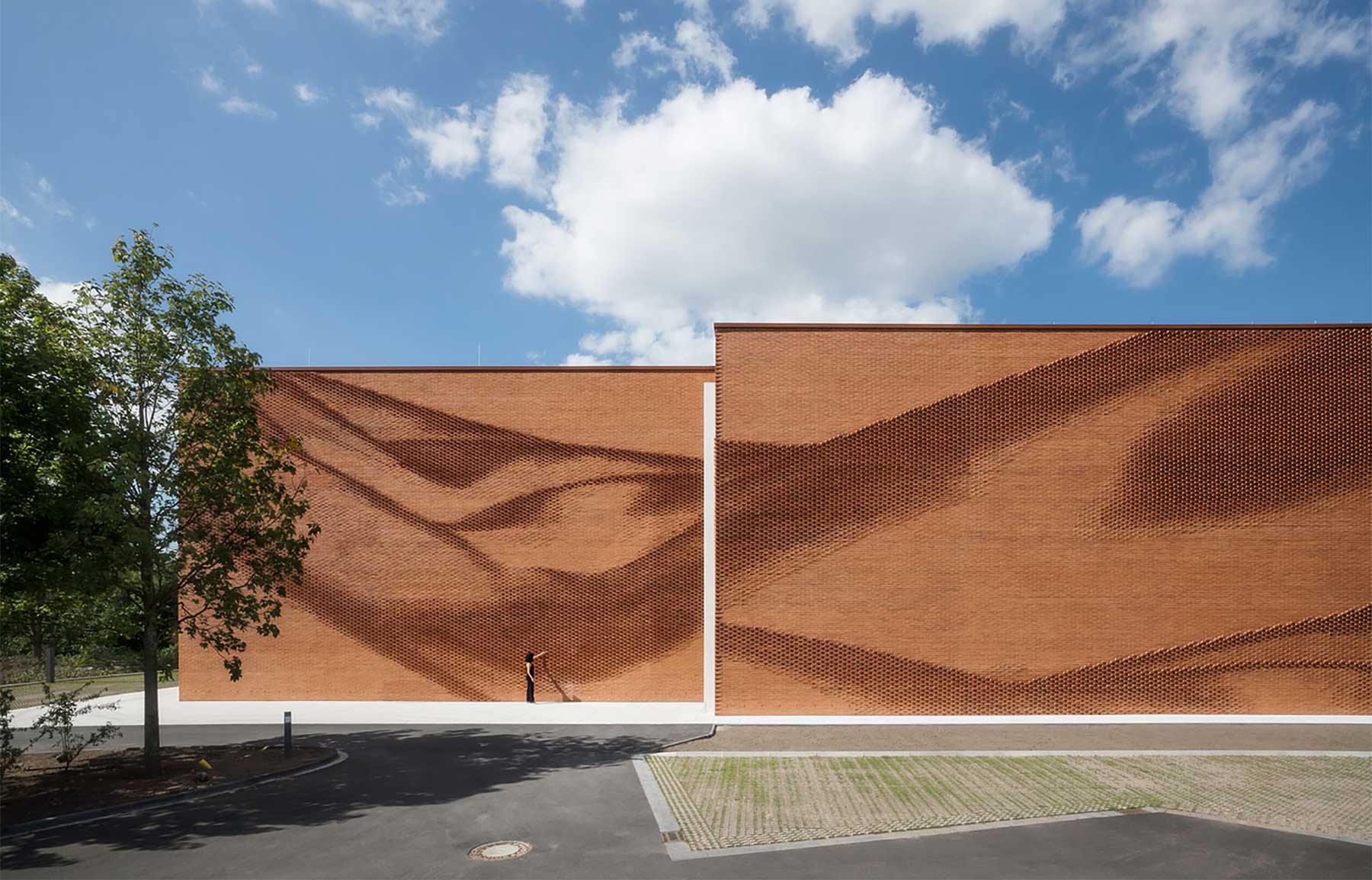 „Die Inspiration für die Ziegelfassade ist der Alabasterfaltenwurf der Beethoven Statue von Max Klinger, die im Leipziger Bildermuseum steht. Max Klinger hat hier eine paradoxe Wahrnehmung geschaffen. Der Betrachter sieht ein scheinbar fließend leichtes Tuch über den Knien von Beethoven und erkennt zugleich, dass es aus massivem Stein besteht. Diesem Bild folgend setzen behet bondzio lin architekten sechs Sondersteine mit gradientenhaft ansteigendem Hub ein, die aus Licht und Schatten eine scheinbar in Bewegung befindliche Fassade erzeugen. Die Analogie zu einem leichten Tuch, über das der Wind streicht, entsteht. Das Auftrennen und leichte Versetzen des Baukörpervolumens erzeugt einen Vorbereich, der die Nutzer und Besucher empfängt und in das Gebäude leitet. Nach Norden öffnet es sich fast vollständig über eine Glasfassade zu dem außergewöhnlich schönen Landschaftsraum. Durch die Nordorientierung sind alle Räume gut mit Tageslicht versorgt und benötigen keinen Sonnenschutz. Dies erlaubt auch im Hochsommer den ganztägigen Ausblick der Mitarbeiter ins Grüne.“