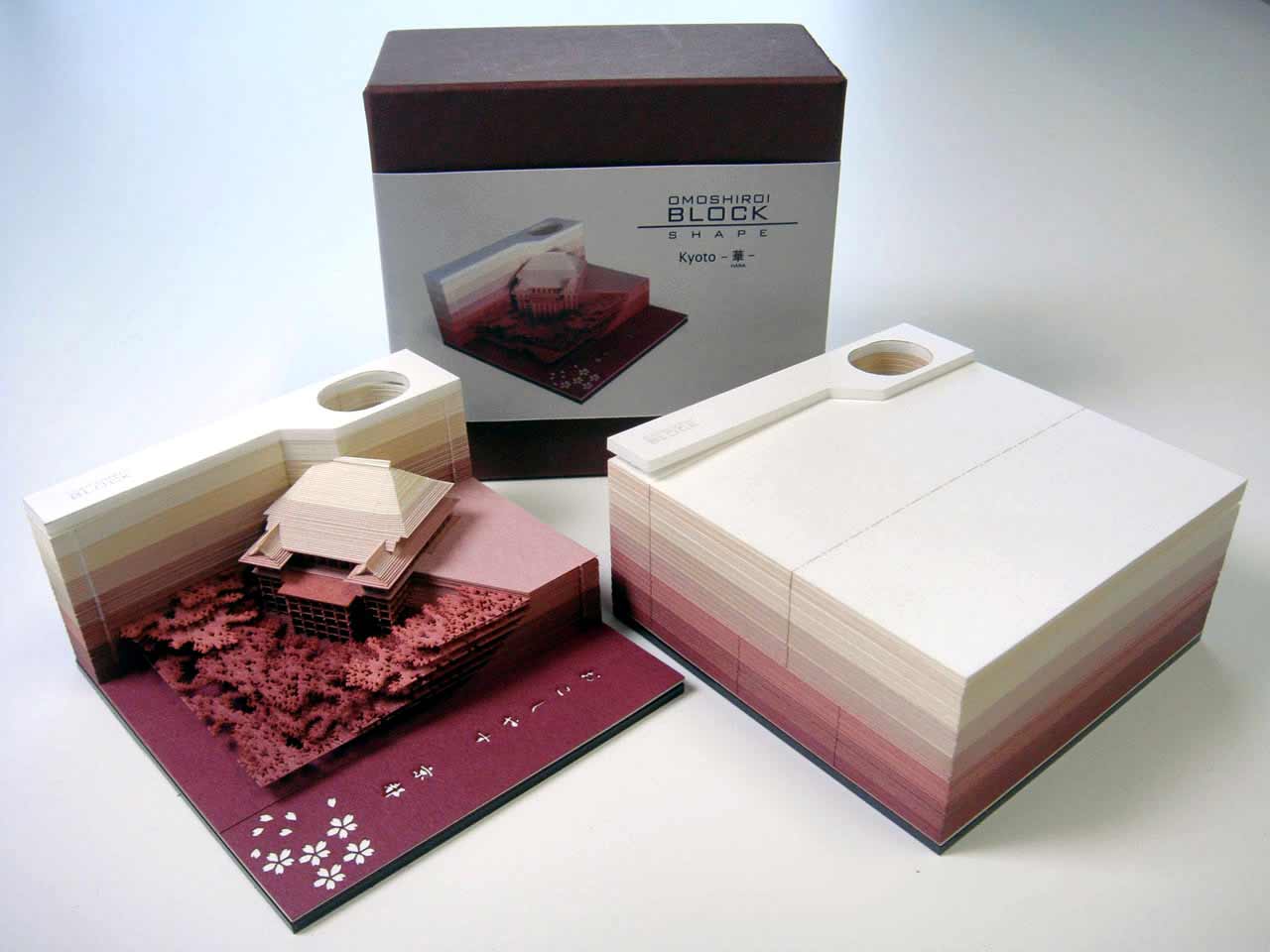 Das nenne ich mal eine klasse Idee! Notizzettel dürften (im leeren Zustand) mit das Langweiligste sein, was der Büro-Alltag zu bieten hat (okay, okay, da gibt es mehr, ich weiß…). Jedenfalls hat der japanische Anbieter Triad die sonst eher einfunktionalen Papierquader mit einer künstlerischen Note versehen. „Omoshiroi Block“ (zu Deutsch: „Spaß-Block“) nennt sich diese Lasergeschnittene Form, bei der jedes Blatt ein bisschen anders als das vorherige ist. Durch das Entnehmen der Notizzettelchen ergibt sich nach und nach eine feinteilige Skulptur (die man bei einigen Motiven gar noch in die Senkrechte aufstellen kann).