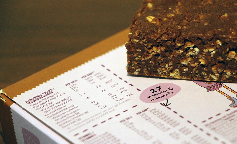 Diese Eigenschaften propagiert Joylent auf der offiziellen Website. Beginnen wir mit dem Start – ist der Twennybar gesund? Auf den ersten Blick vielleicht nicht. Knapp über 100 Gramm pro Riegel bedeuten auch rund 400 Kcal und 13 Gramm (natürlichen) Zucker. Nichts für kalorienzählende Diätler. Aber daran soll sich demnächst etwas ändern, denn die Leute von Joylent haben das Kundenfeedback verarbeitet und arbeiten daran, den Zuckergehalt je Riegel auf 5,4 Gramm zu senken – wir essen eh schon alle viel zu viel am Tag. Ein bisschen was braucht der Riegel aber natürlich, soll er doch vor allem Leistung bringen und sogar kleine Mahlzeiten ersetzen. Das Wichtigste kommt nämlich am Ende der Nährwertsauflistung. Von etlichen Vitaminen und Mineralien, die wir sonst vielleicht nicht oder zu wenig an einem normalen Tag zu uns nehmen, sind (mindestens) 20 Prozent enthalten. 27 wichtige Nährstoffe an der Zahl. Not bad. Und genau das ist am Ende eine gesündere Form des Müsliriegels.