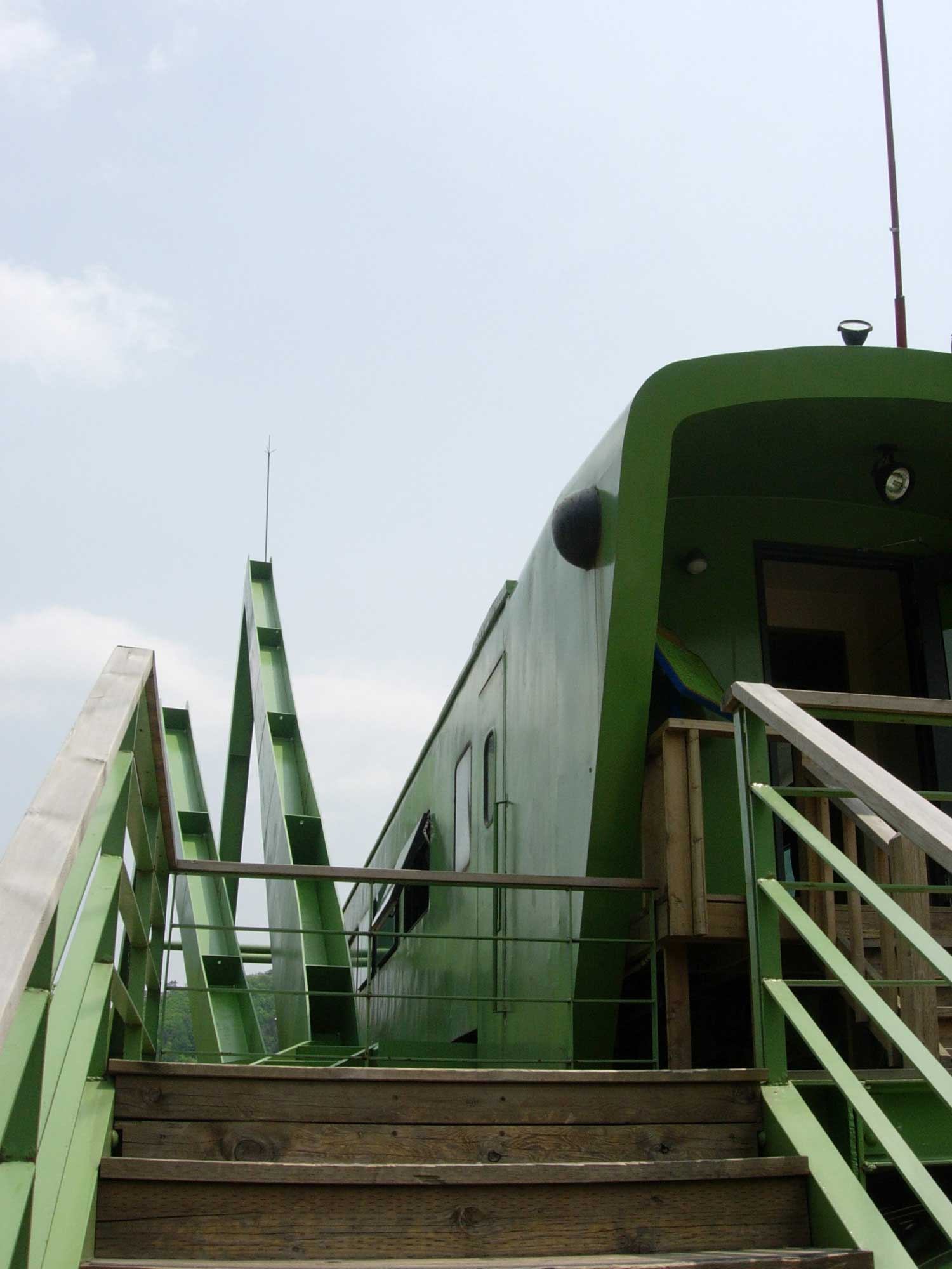 An der „Auraji Rail Bike Route“ (Station Gujeol-ri) nahe des südkoreanischen Jeongseon kann man sich in den „Grasshopper’s Dream“ setzen. So heißt das Café, das aus zwei übereinander gelegten alten Zugwaggons besteht, die entsprechend grün angemalt und mit „Stahlträgerbeinen“ die Gestalt zwei übereinander liegender Grashüpfer angenommen haben. Ein nettes Stück Architektur-Kunst.