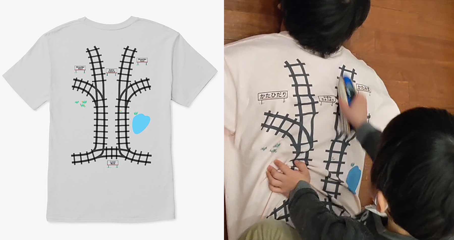 以前作った「寝転がってるだけで子供がマッサージしたくなるTシャツ」をきれいに作り直して出品した:https://t.co/o4QXllvo8h 背中にプラレール幅対応のレールが描いてあるので、子供が大喜びでプラレールを走らせてくれます。気持ちいいです。 pic.twitter.com/5wZ8poE5hJ