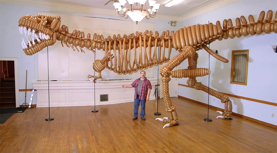 Mark Verge darf sich Weltmeister im „Balloon Modelling“ nennen. Sein größtes Luft-Werk ist dieser gigantische T-Rex. Im Video von Coolest Thing bekommen wir nicht nur sehen, wie das Teil aufgebaut wurde, sondern auch einige weitere Werke des Ballon-Künstlers. Wenn ihr also mal wieder wen mit eurer tollen Luft-Schlange beeindrucken wollt – forget it!