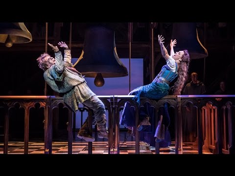 Weil Aufnahmen während der Aufführung verboten waren, hier ein Pressefoto (von Johan Persson © Disney) der beiden Hauptdarsteller David Jakobs und Sarah Bowden (als Quasimodo und Esmeralda):