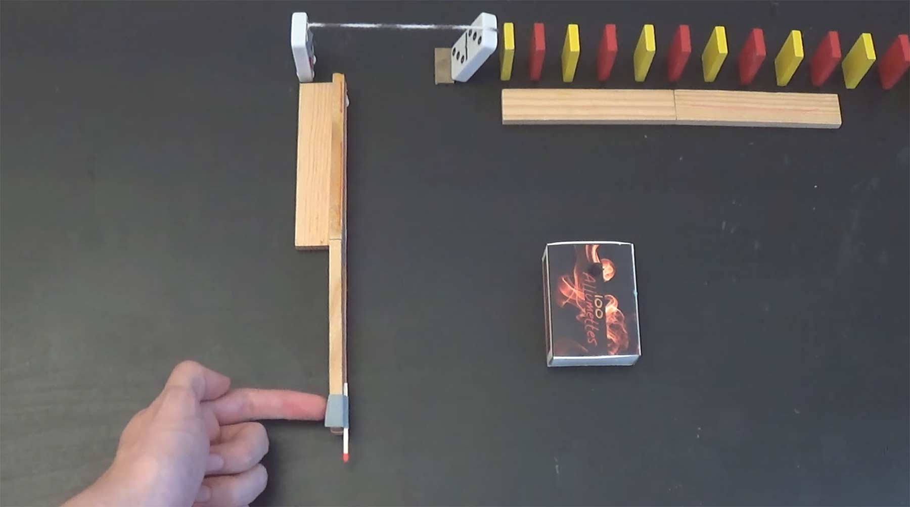 „The main idea of the video was to create a project with fire because it’s impressive and rare to see it in a Chain Reaction (as an example, there are much more tricks with air). And when there is fire it’s generally just a moving candle that burns a rope. But there is a problem with candles, you have to light it just before starting the reaction. It would be better to find a way for the reaction itself to light the fire just at the moment you need it.“