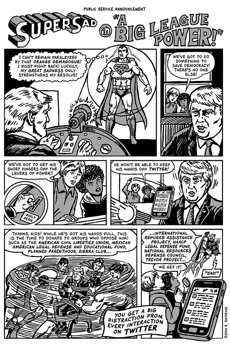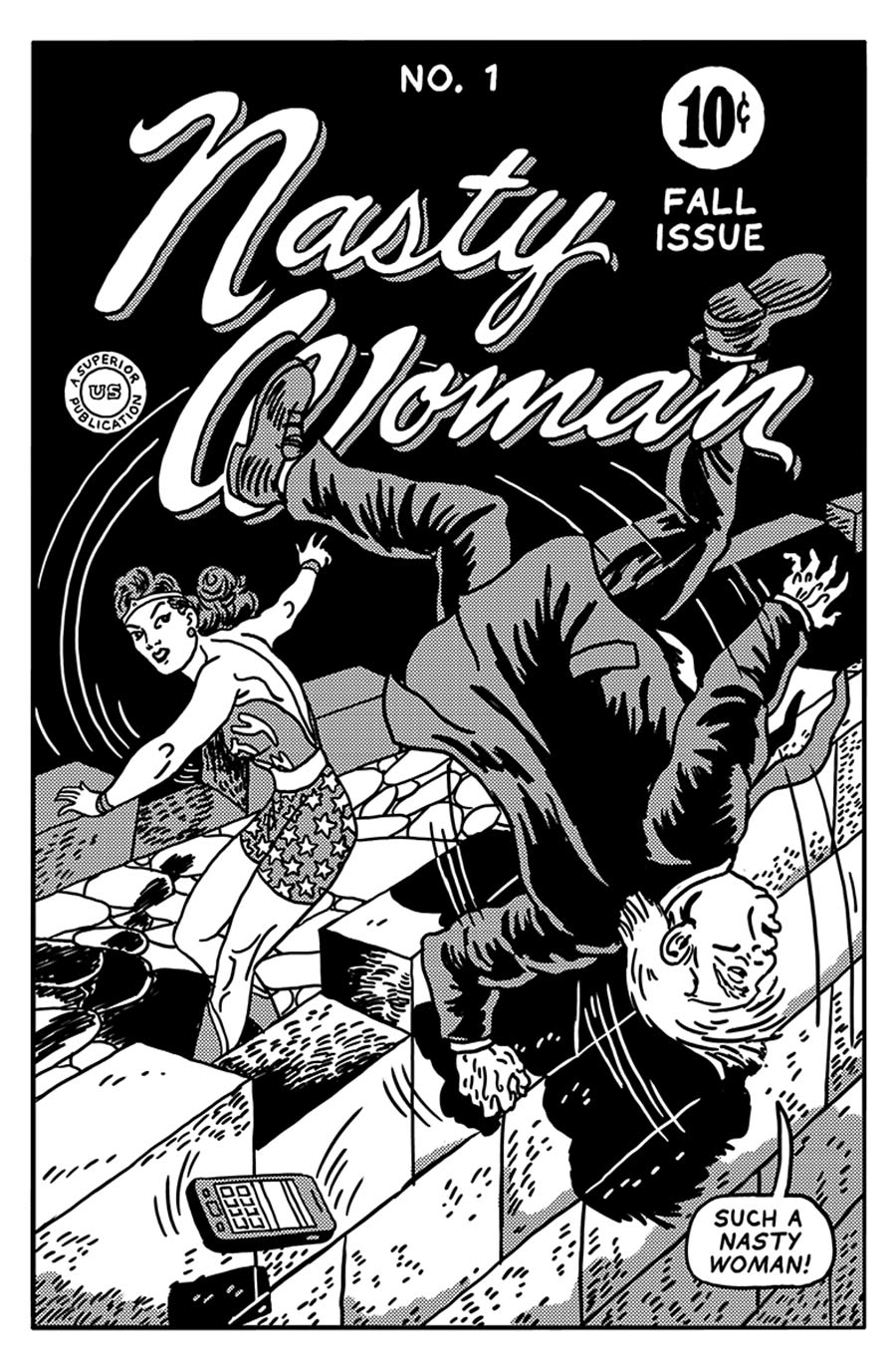 Auf Donald Trump wird gerade (zurecht) eine ganze Menge eingeschlagen und Blödsinn zusammen gebastelt. Eine besonders schöne Variante davon bietet R. Sikoryak, der mit The Unquotable Trump einige tatsächlich vom US-Oberhaupt(!) gesagten Zitate auf von ihm gezeichneten Comicseiten packt. Nicht wenig überraschend funktioniert Trump als Bösewicht nicht wirklich schlecht…