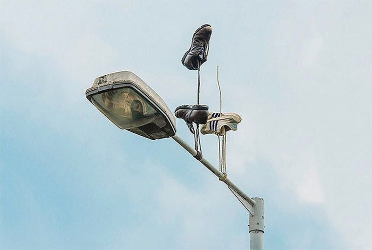 Eine interessante Installationsreihe des Künstlers Pejac, der in London ein paar Sneaker an Laternen hinaufhängen lässt. Im Rahmen der Ausstellung Downside Up trotzt er vermeintlich der Schwerkraft und lässt Passanten unglaubwürdig gen Himmel schauen. Klasse Idee!