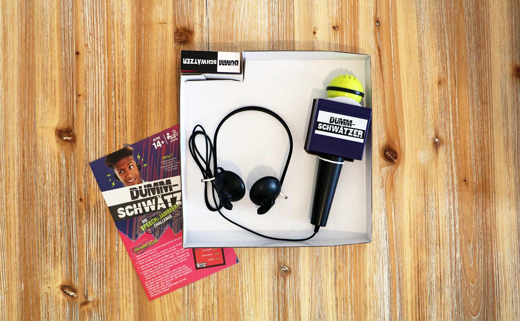Um es direkt zu sagen: Die Packung könnte kleiner sein. Neben dem Mikrofon und den recht kompakten Kopfhörern ist lediglich ein kleines Set Karten enthalten – und jede Menge Luft. Vorteil dieser recht spartanischen Ausstattung: Das Regelheft ist vielmehr ein Regelzettel und es kann binnen weniger Minuten losgehen.