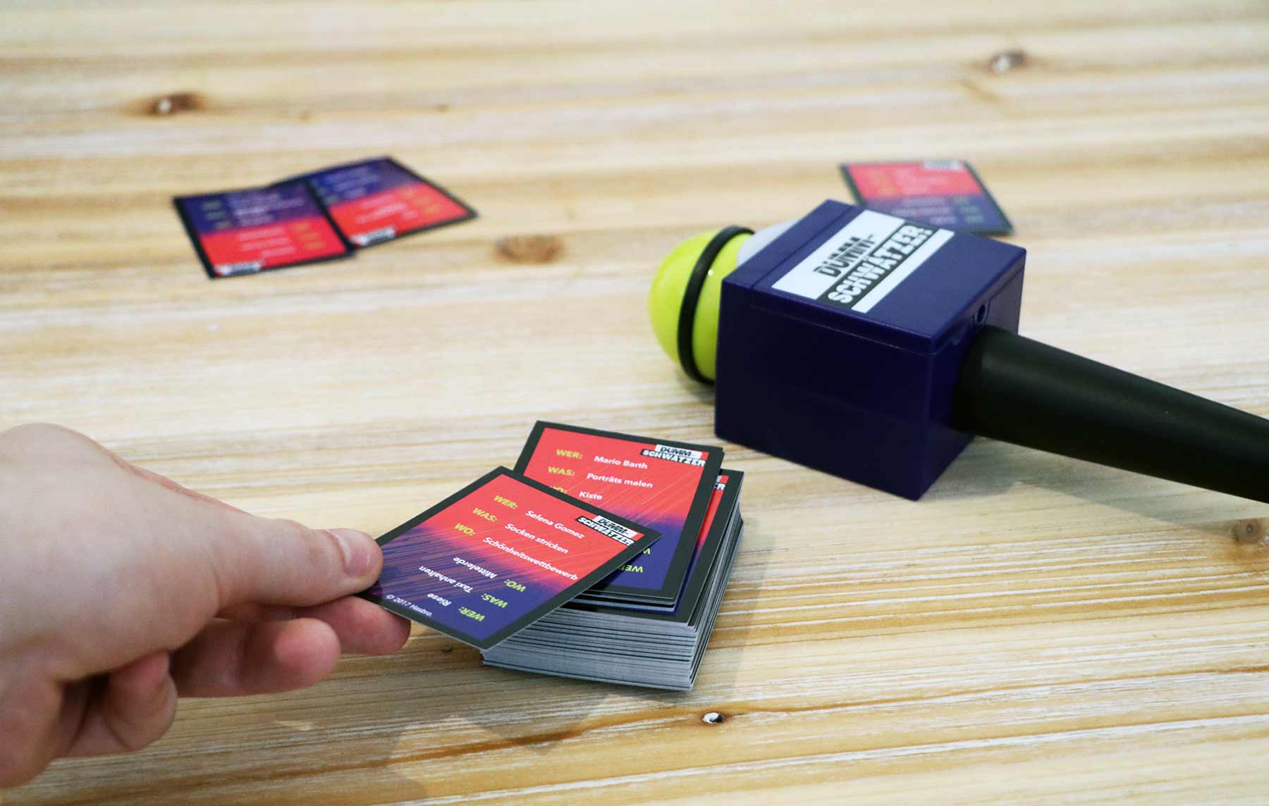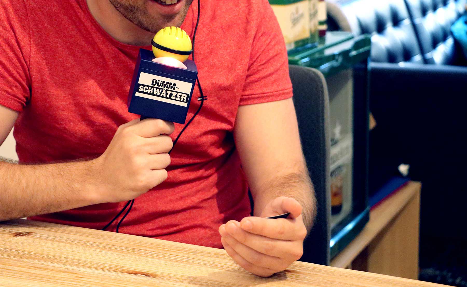 Müsste man es kurz zusammenfassen, dann ist „Dummschwätzer“ wohl so etwas wie „Tabu“ für Stotterer. Das Prinzip ist einfach: Drei Sachen stehen auf einer Karte, auf die die Teamkollegen kommen sollen, ohne dass man sie jedoch explizit nennen darf. Eine Person, eine Tätigkeit und ein Ort. Dieses eher klassische Setting wird dann durch das Mikrofon ins Absurde geführt.