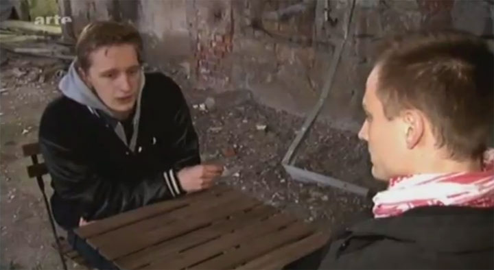 Leider gibt es keine bessere Version aktuell, außer dieser verpixelte Vierteiler auf Youtube. Die arte-Mediathek scheint das Vide aktuell nicht abspielen zu wollen. Yay, die arte-Variante tuts wieder (Danke an die Kommentare, gingen vorher beide nicht). Langt aber um zu sehen, wie die beiden Bands Chemnitz unsicher machen und sich Gegenseitig interessant Hintergrundinfos aus den Rippen erfragen.