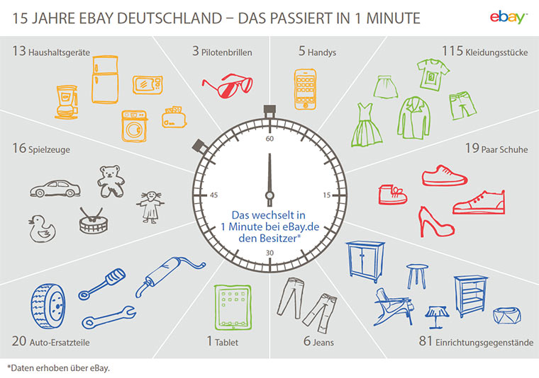 Seit eBay durch den Aufkauf von alando in den deutschen Markt eingetreten ist (die US-Ausgabe gibt es seit 3. September 1995), wurden alleine hierzulande etwa 3 Milliarden Artikel verkauft, deren Gesamtwert 97 Milliarden Euro beträgt. Das sind definitiv keine Peanuts. Was so alles mittlerweile pro Minute über den digitalen Ladentisch geht, könnt ihr der nachfolgenden Infografik entnehmen. Von den 1999 bei eBay registrierten Nutzern sind übrigens noch heute etwa 340.000 aktiv.