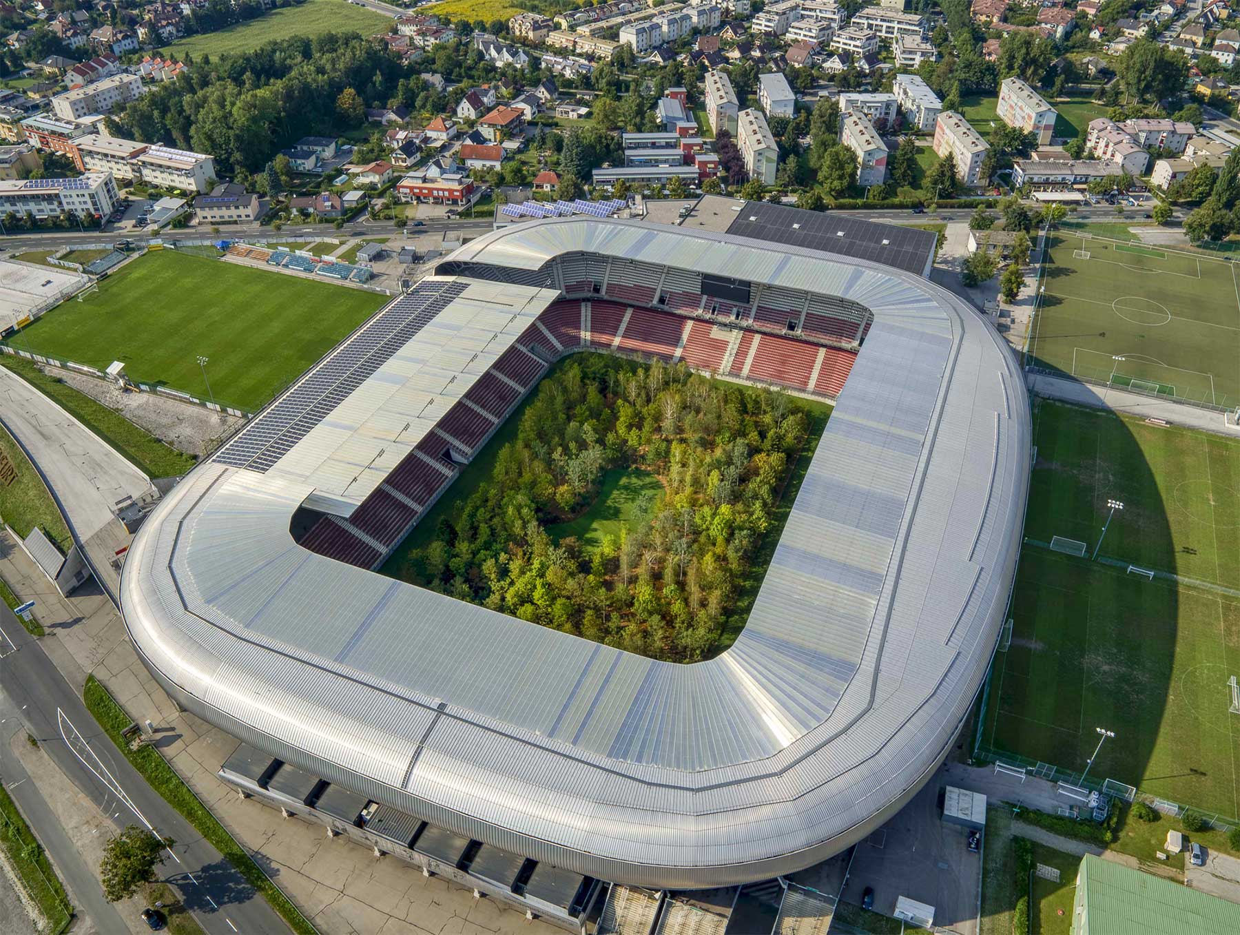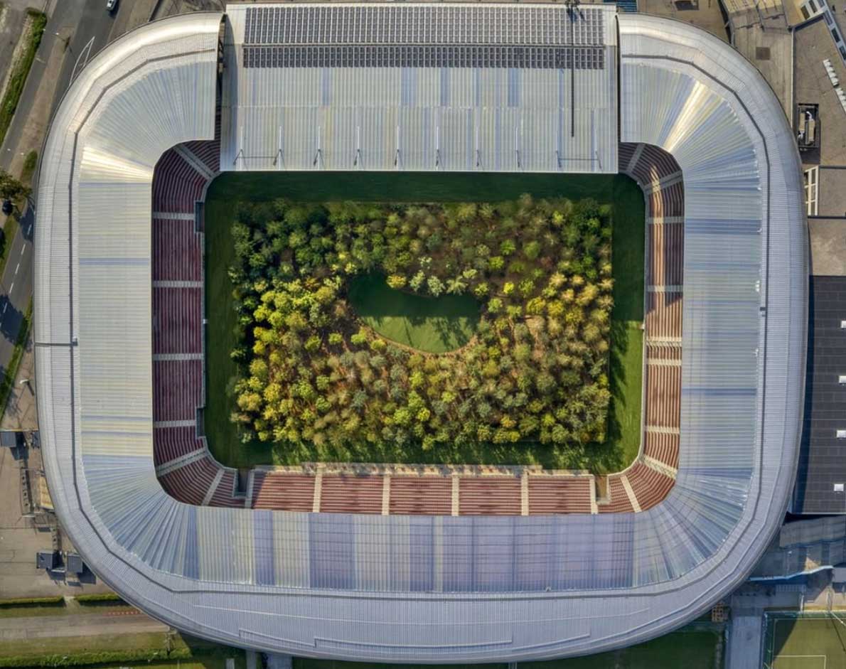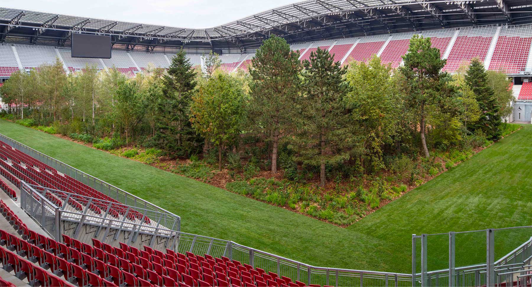 Im Wörthersee Stadion trägt eigentlich der Fußballverein SK Austria Klagenfurt seine Heimspiele aus. Doch bis 27. Oktober kann man im österreichischen Sportumfeld auch den Wald vor lauter Bäumen sehen. Denn Künstler Klaus Littman hat die sonst so freie Rasenfläche voller Bäume besetzt. 300 an der Zahl, fein säuberlich im Rechteck angeordnet (mit kleiner Lichtung in der Mitte). „For Forest – The Unending Attraction of Nature“ heißt das Projekt, das bereits auf Foto beeindruckende Motive bereithält. Vor Ort, live von einer der Tribünen im fast leeren sonst 30.000 Leute fassenden Stadtion betrachtet, muss das nochmal eine Ecke cooler wirken.