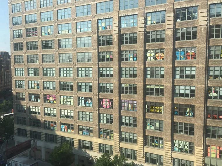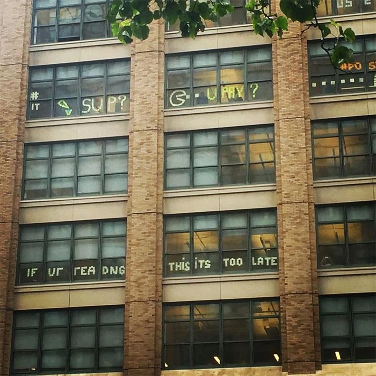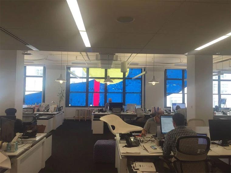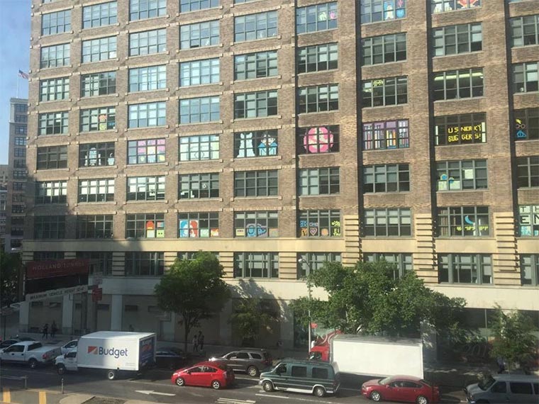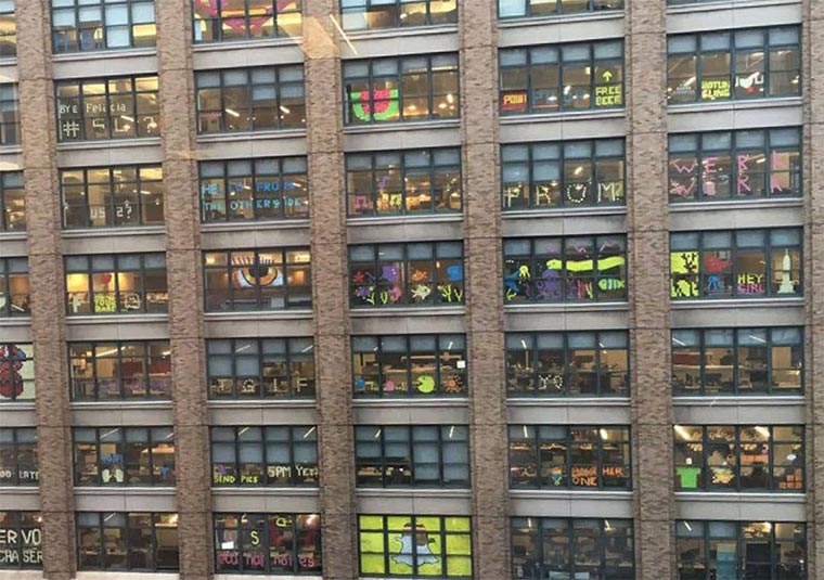 Dass es überhaupt noch Post-It-Kriege gibt… Jedenfalls hat ein Mitarbeiter des New Yorker Unternehmens Harrison and Star ein eigentlich harmloses „Hi“ ans Fenster geklebt. Wie einfallsreich. Und doch reagierte kurze Zeit später das Gebäude gegenüber – und ehe man sich versieht, befinden sich etliche Betriebe im kreativen Wettstreit um die originellsten Klebezettel-Motive. Bis dann ein Gebäude den großen Hammer raus holt. Respekt!