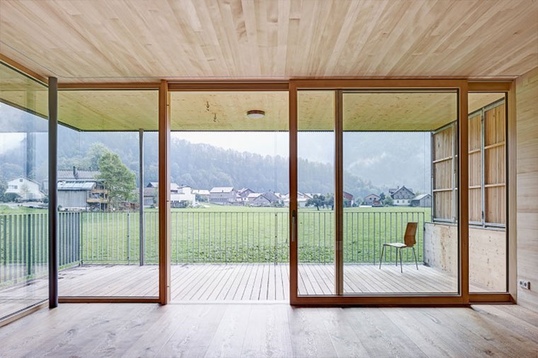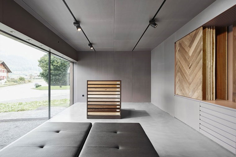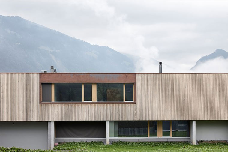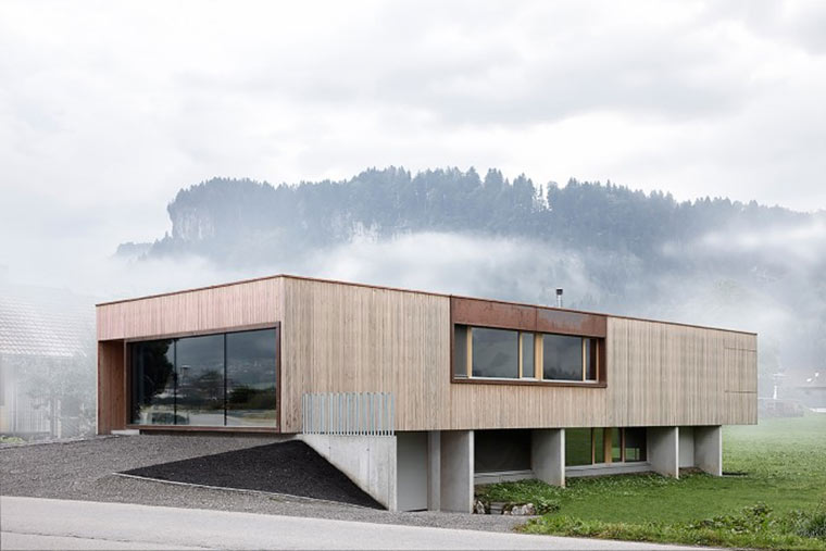 Das Innsbrucker Architektur-Büro ao Architekten hat im österreichischen Bregenz dieses massiv und doch leicht wirkende Blockbau-Konzept aufgestellt. Das Gebäude trägt tatsächlich den Titel Einfamilienhaus mit Schauraum und bietet nicht nur einen sensationellen Ausblick, sondern auch allerlei Stauraum, was dem kubistischen und somit platzfreundlichen Grundaufbau entspringt. Dabei ist dieses Raumwunder von der Eingangsseite gar nicht so schnell ersichtlich, da es sich um einen erdintegrierten Bau mit langer Flucht handelt. Insgesamt eine sehr schicke Holz-Beton-Fusion.