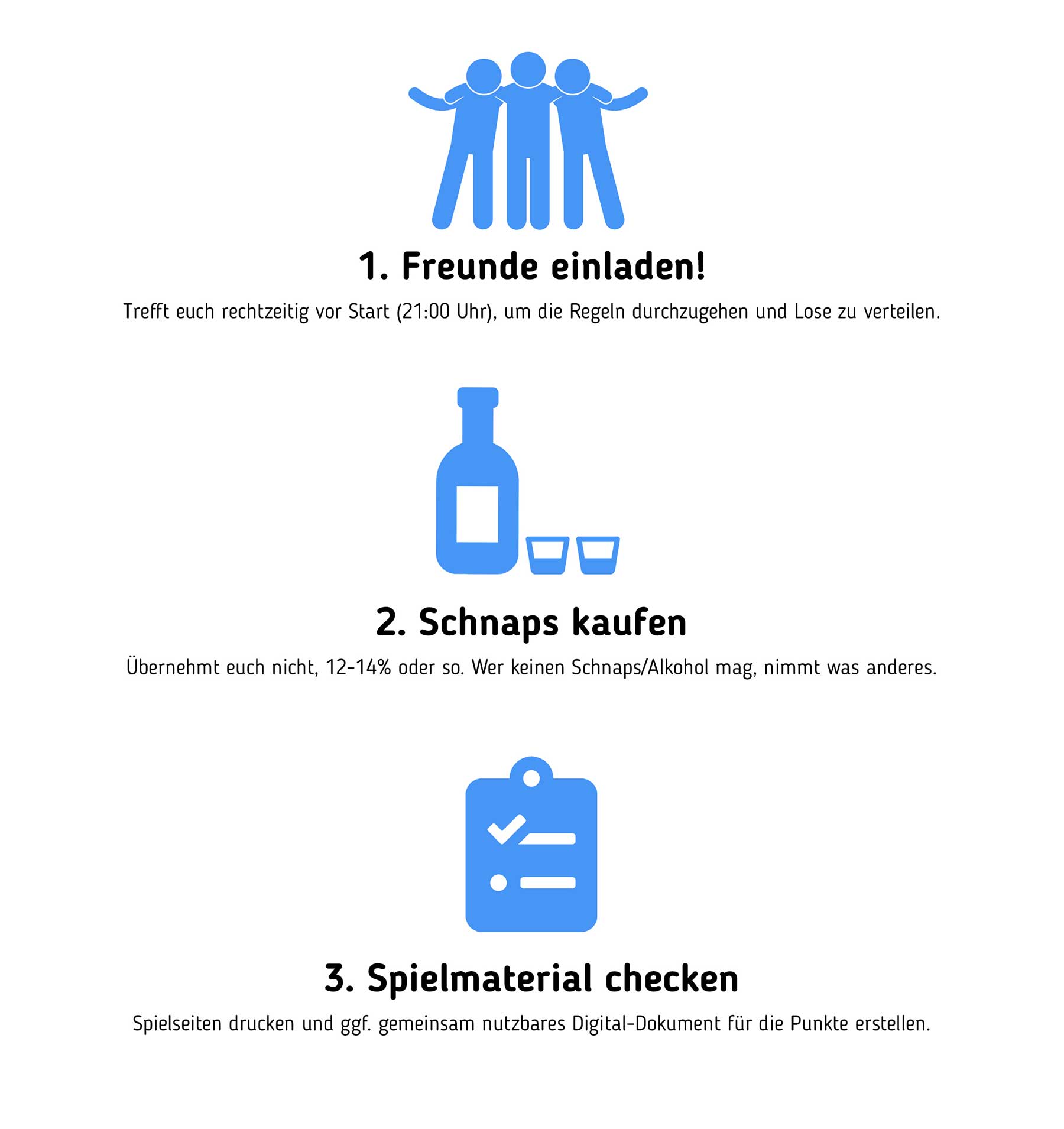 Ein bisschen was solltet ihr vor Samstagabend bereits erledigt haben. Da solche Spiele eigentlich nur in Gesellschaft Spaß machen, solltet ihr euch ein paar Freunde einladen. Entweder real ins Wohnzimmer oder online per Videokonferenz (Zoom, Skype, Whatever), wie ihr mögt. Dann braucht es natürlich Einkäufe – neben Snacks vor allem Schnaps für die notwendigen Shots. Dabei empfehle ich etwas, von dem die Teilnehmer:innen gut und gerne 10-30 trinken können, also lieber etwas, das weniger Umdrehungen hat (Saure Kirsche, XUXU, halt irgendwas mit 12-16 Umdrehungen oder so). Ihr könnt natürlich auch einfach nicht so voll gießen oder nur am Bierchen nippen – je nachdem, was ihr am besten vertragt.