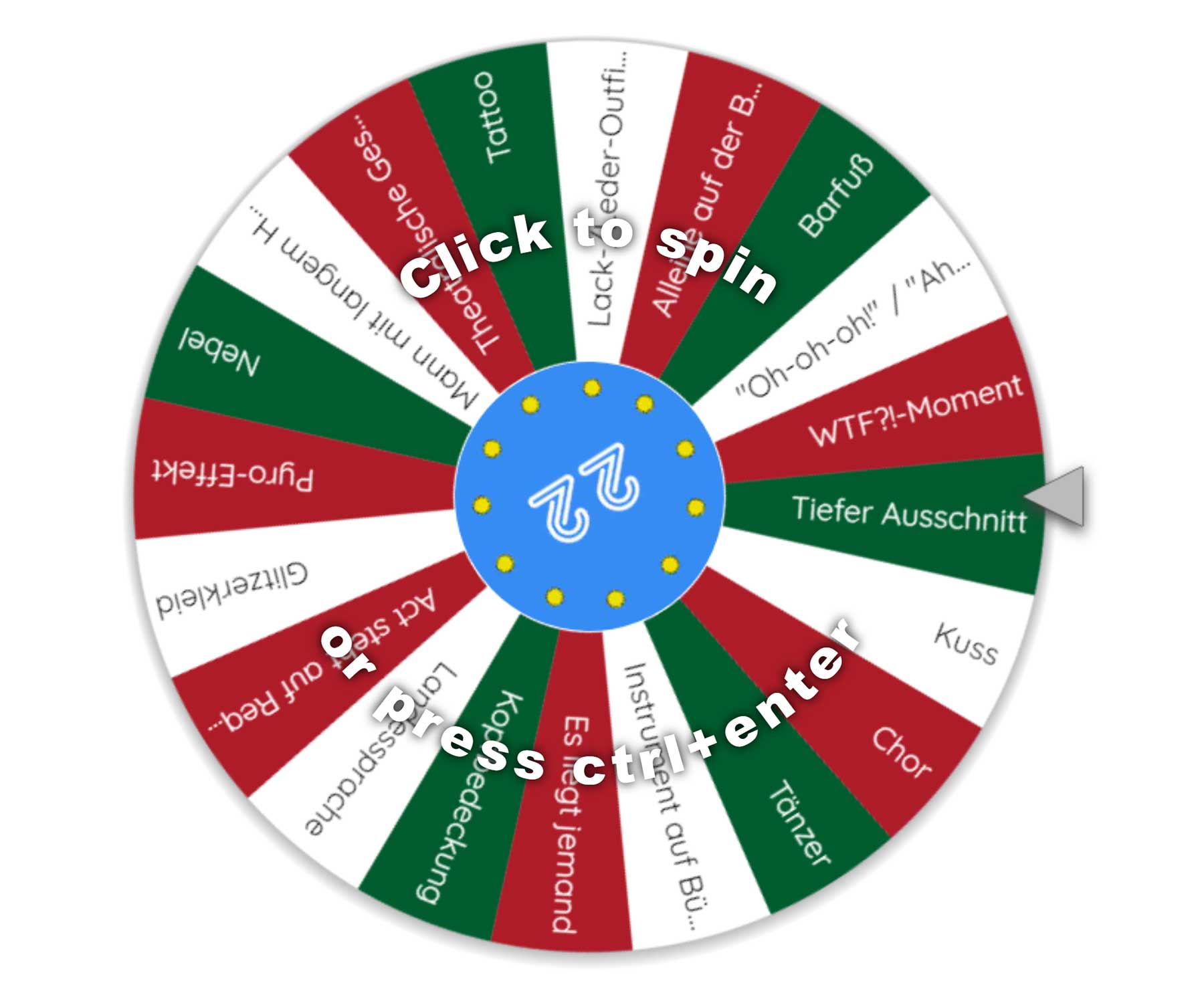 Zum Ablauf: Auch die Länderlose werden unter den Teilnehmenden verteilt (nehmt so viele, wie ihr euch traut, lieber erstmal mit einem Land beginnen, hier gibt es nicht nur 26 Auftritte sondern über 40 Länder, die Punkte verteilen!) – ich habe auch hierzu ein digitales Drehrad vorbereitet. Gezogene Länder sind „Patenländer“. Immer, wenn „euer“ Land bei der Punktevergabe 8, 10 oder 12 Punkte einsackt (also, auf das Punkte-Treppchen eines anderen Landes landet), müsst ihr trinken. Habt ihr mehrere Länder, die jeweils in den Top 3 einer Landes-Verkündung gelandet sind (also z.B. Deutschland 8 Punkte (haha, als ob!) und Island 12 Punkte), müsst ihr mehrfach trinken.