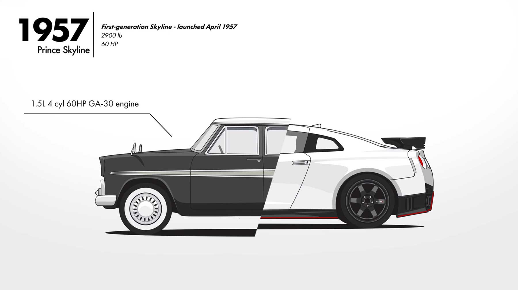 „From the early days as a Prince Skyline and Skyline Sedan, to the Kenmeri GT-R, the R30 / GC210 and the Super Silhouette, to the R31 2000GTS-R, R32 GT-R, R33, the legendary Calsonic GT-R and Pennzoil Nismo GT-R, to the modern R35 GT-R (which isn’t a Skyline!). „