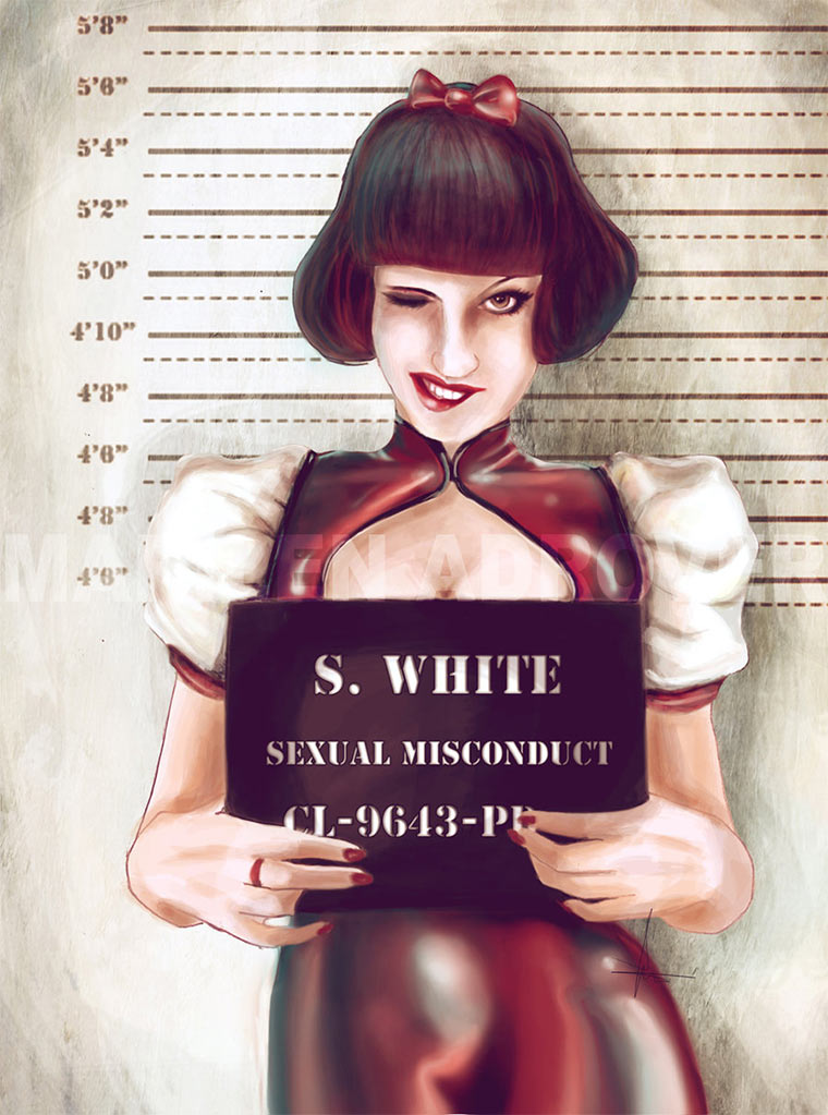 Die spanische Illustratorin Marilen Adrover scheint Märchen zu mögen, aber nicht dieses schmierig-glatte Sauber-Image der Figuren. Prompt hat sie einigen Prinzessinnen einen ungewohnten Anblick verpasst: bei der Verhaftung. Leider gibt es bislang nur vier dieser kreativen und skurrilen Mugshots – bitte mehr davon!