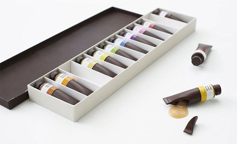 Na das wäre doch mal die ideale Adventskalenderidee für die Künstler unter euch. Ein Farbtubenkasten, die nicht aus Tuben und Farbe ist, sondern aus Schokolade und Sirup. Toll umgesetzt vom japanischen Designer Nendo.