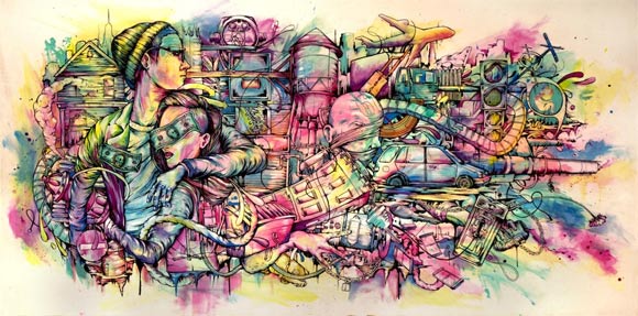 Pat Perry macht sehr stileigene Arbeiten mit jeder Menge Farbe und Illustrations- und Zeichnungseinflüssen. Dabei bescherrt er uns auch ein paar Speedpaintingvideos, die den interessanten Entstehungsprozess der teils riesigen Bilder offenlegen.