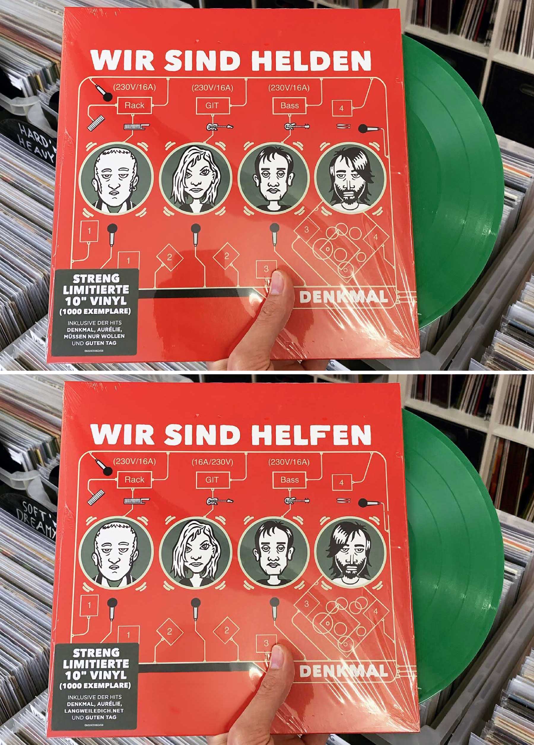 Zur Feier des Feiertages habe ich zehn Unterschiede zwischen den vermeintlich identischen Bildmotive eingebaut. Ich habe also quasi ein weiteres Denkmal gebaut (oder beschmiert, wenn man so will…). Da ich das Cover leider nicht in einer feinen Promo-Form habe finden können, habe ich ein Bild mit Drumherum genommen, das ich bei Retrotrain auf Facebook entdeckt habe. Im Plattenladen hat das doch gleich noch mehr Charme, finde ich. Viel Erfolg und Spaß bei der Suche!