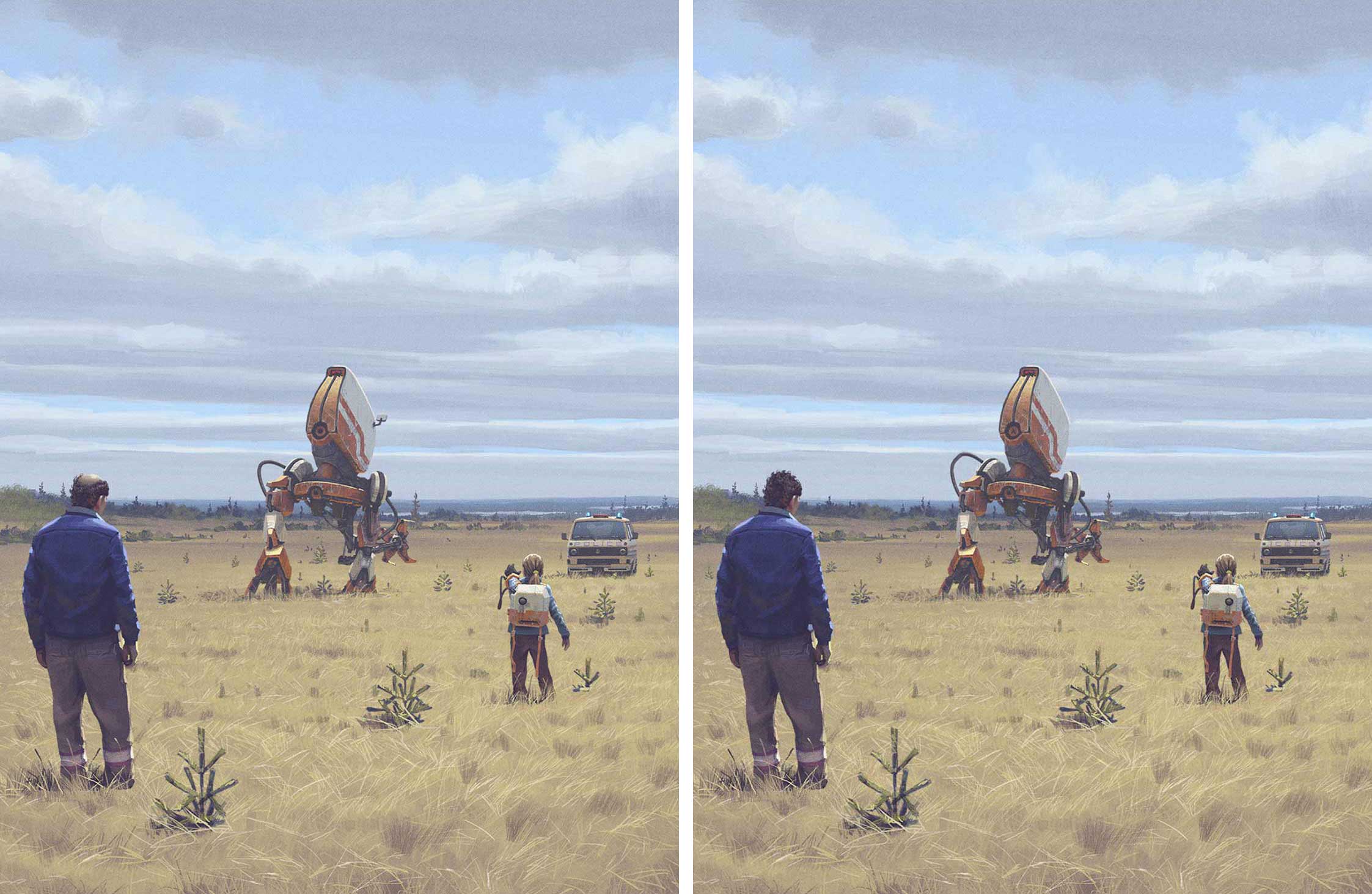 Heute startet nämlich die erste Staffel der neuen Serie „Tales from the Loop“ bei Amazon Prime Video. Das Besondere an der Serie (neben der Tatsache, dass die fantasievollen Geschichten sehr reizvoll umgesetzt zu sein scheinen) ist die Tatsache, dass die Geschichten auf Bildern basieren. Genauer gesagt auf Digital Paintings des schwedischen Künstlers Simon Stålenhag, den ich sogar 2018 bereits hier im Blog gefeatured hatte. Entsprechend ist auch das heutige Bild eines der Promo-Motive in Kunstwerkform von einem der Key Art-Poster. Darin habe ich 12 Unterschiede eingearbeitet, die es zu finden gilt. Wie schnell schafft ihr das?