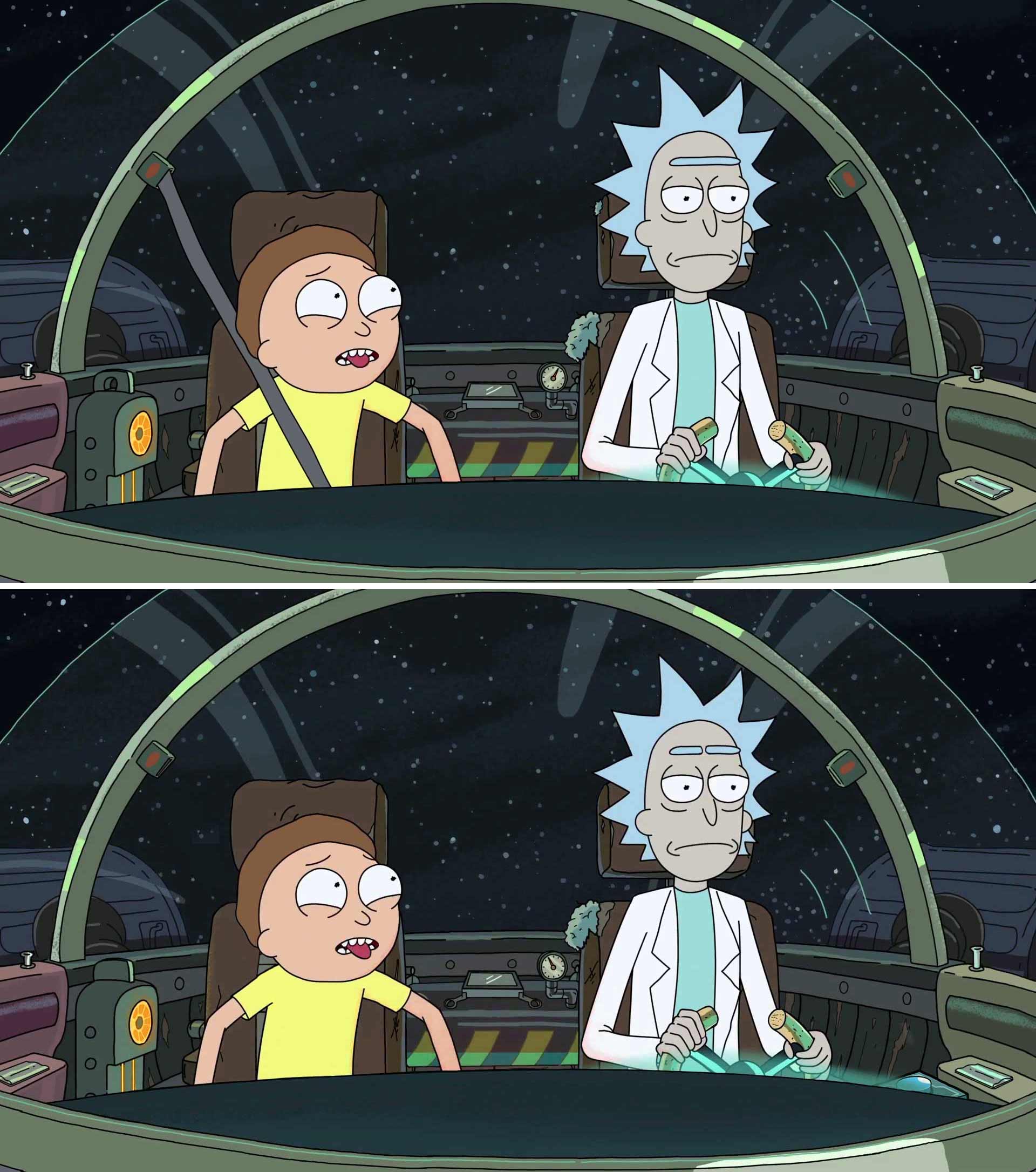 Rick und Morty befinden sich im Raumschiff. Dieser Aspekt ist in beiden Bildern identisch. Aber wie sich durch einen gewaltigen Twist herausstellt, stammen die beiden Aufnahmen aus unterschiedlichen Wirklichkeiten des Multiversums! Könnt ihr die 12 Unterschiede entdecken? Viel Spaß beim Suchen!