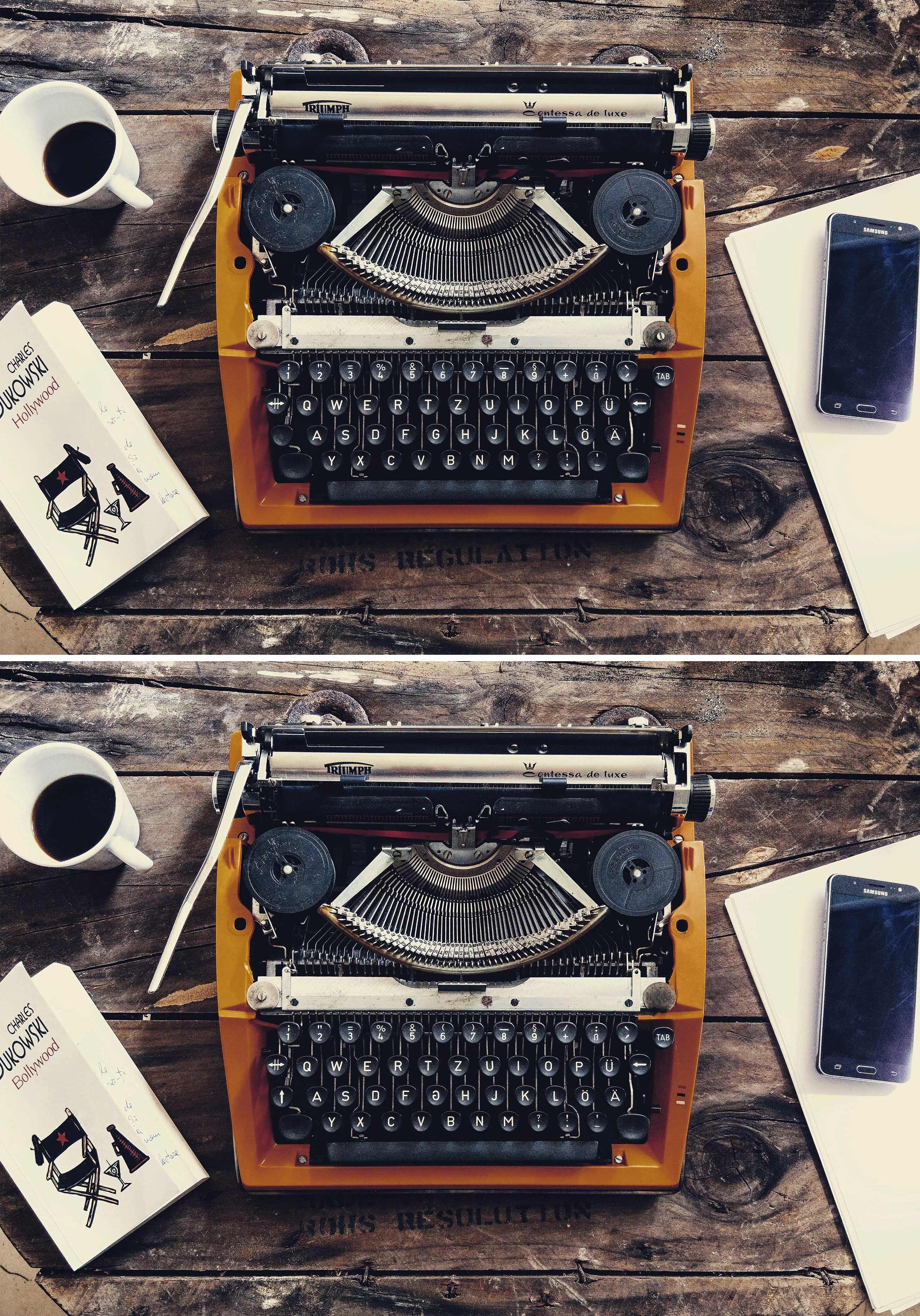 Hach, Schreibmaschinen sind einfach sooo toll! Retro-Feeling pur und seitdem wir selbst eine hier bei uns stehen und sie auch mal benutzt haben, bin ich auch großer Fan der für damalige Verhältnisse erstaunlichen Mechanik, die hinter dem „Tinte auf Papier bring“-Gerät steckte. In diesem Bild stecken übrigens 13 Unterschiede, die es auszumachen gilt für euch. Könnt ihr sie alle richtig tippen?