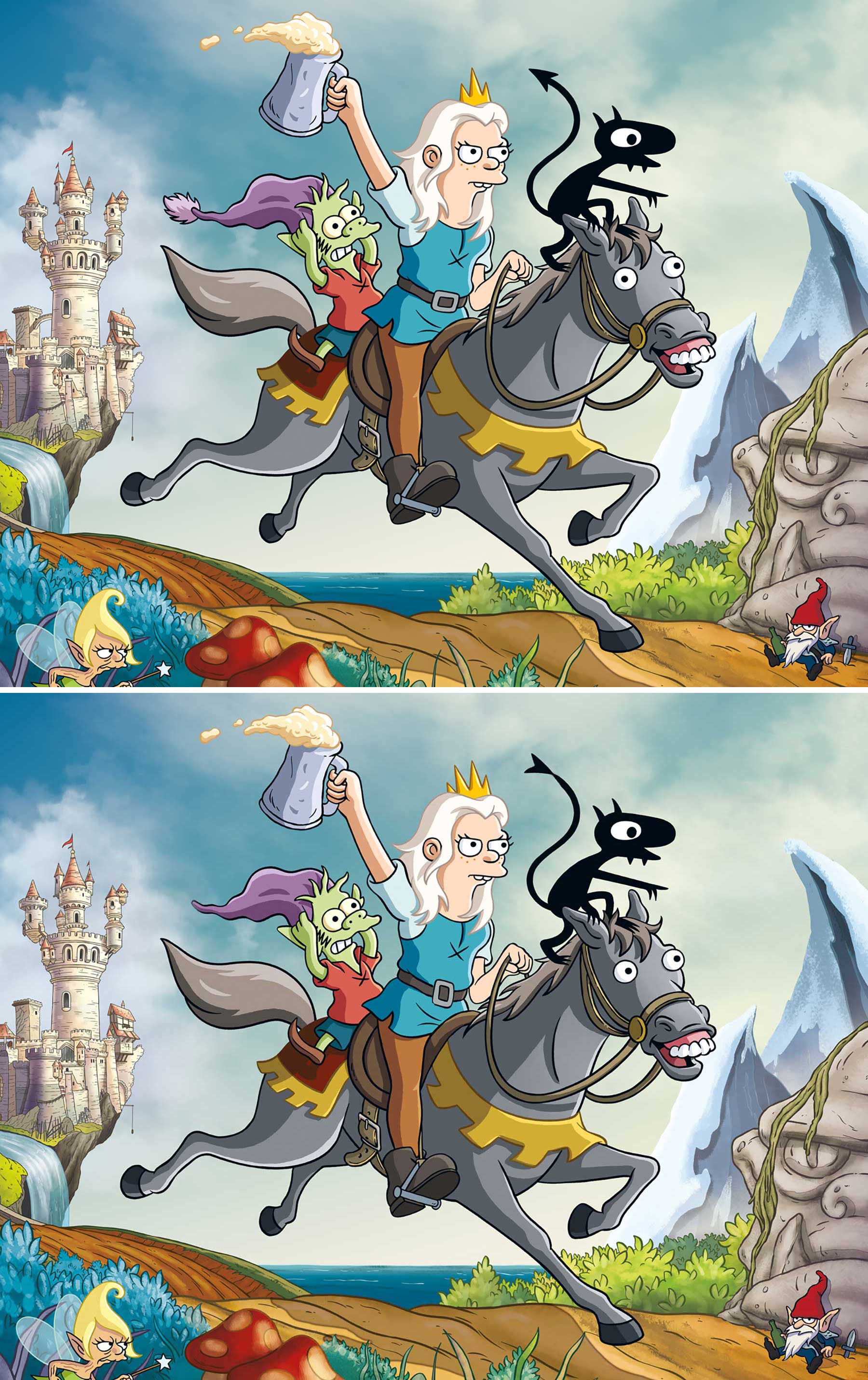 Heute startet der dritte Teil (und somit quasi die zweite Staffel…) der Animationsserie „Disenchantment“ auf Netflix. Die ersten zwei Runden fand ich ja durchaus gelungen. Kein Must-See, aber deutlich mehr als nur „Die Simpsons“ im Mittelalter (die Serie stammt wie auch Futurama von Serienschöpfer Matt Groening). Ich habe den Staffelstart jedenfalls zum Anlass genommen, euch 10 Unterschiede in das Promobild zu packen. Könnt ihr alle finden?