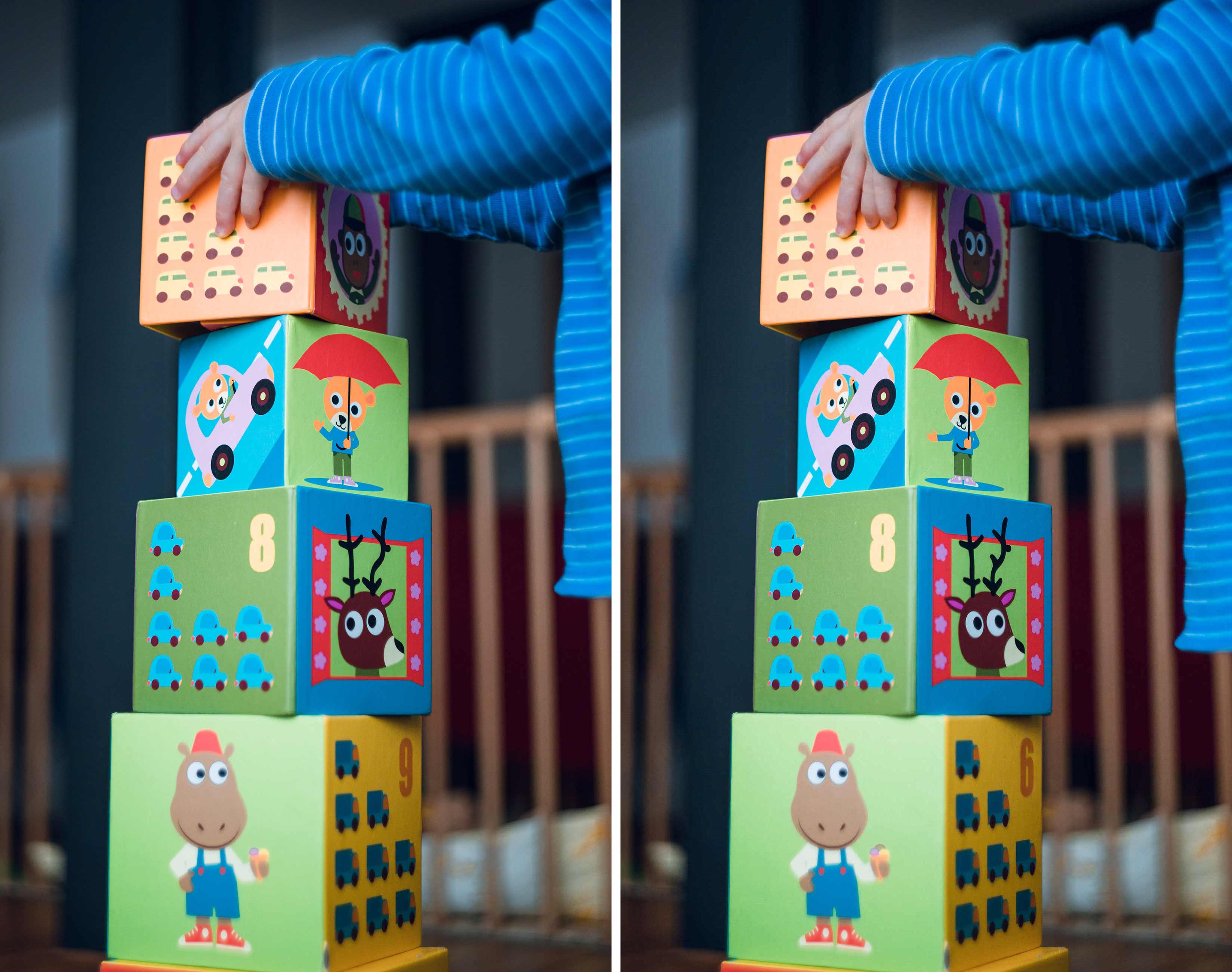 Turmbau zu Baby steht heute an. Ein Kleinkind hat ein paar Schachteln aufgetürmt, aber in den vermeintlich identischen Bildern verstecken sich zehn Unterschiede – könnt ihr sie alle finden? Viel Spaß beim Suchen!