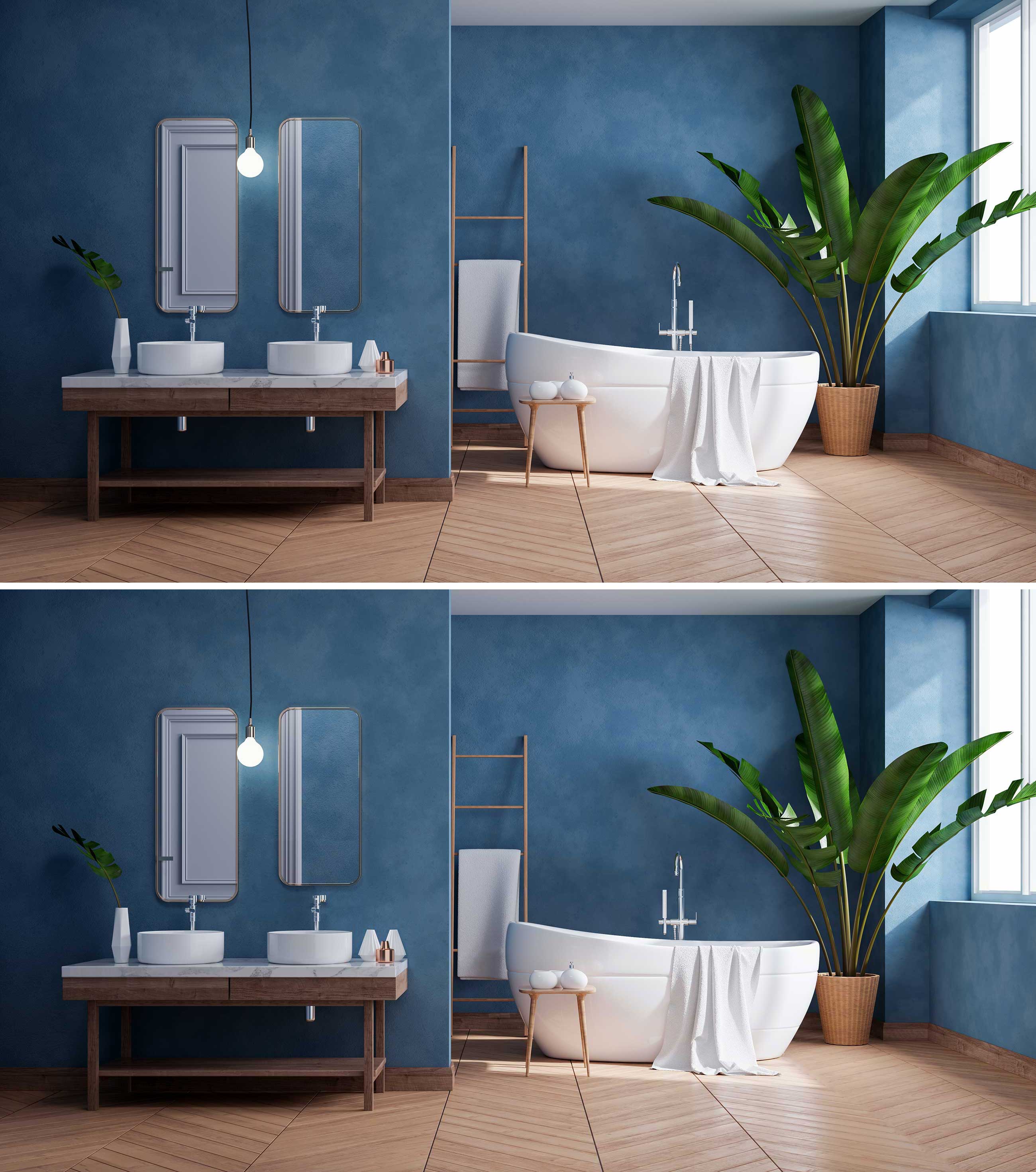 In Möbelkatalogen oder Wohnungsannouncen der Sorte, die ich mir nicht leisten kann, könnten solche Bilder wie dieses hier zu sehen sein. Stilvoll eingerichtet, mit schicker freistehender Badewanne und 10 Unterschieden – viel Spaß beim Suchen!