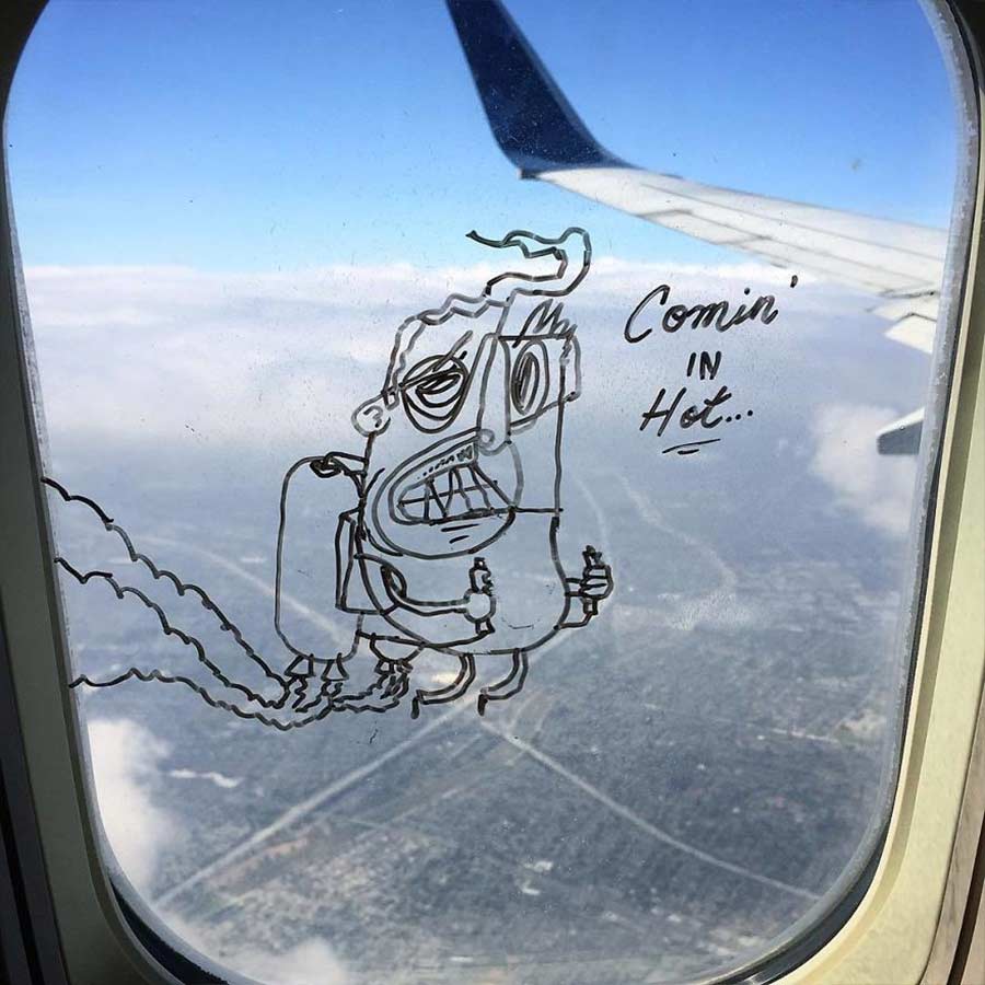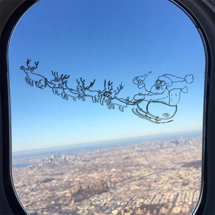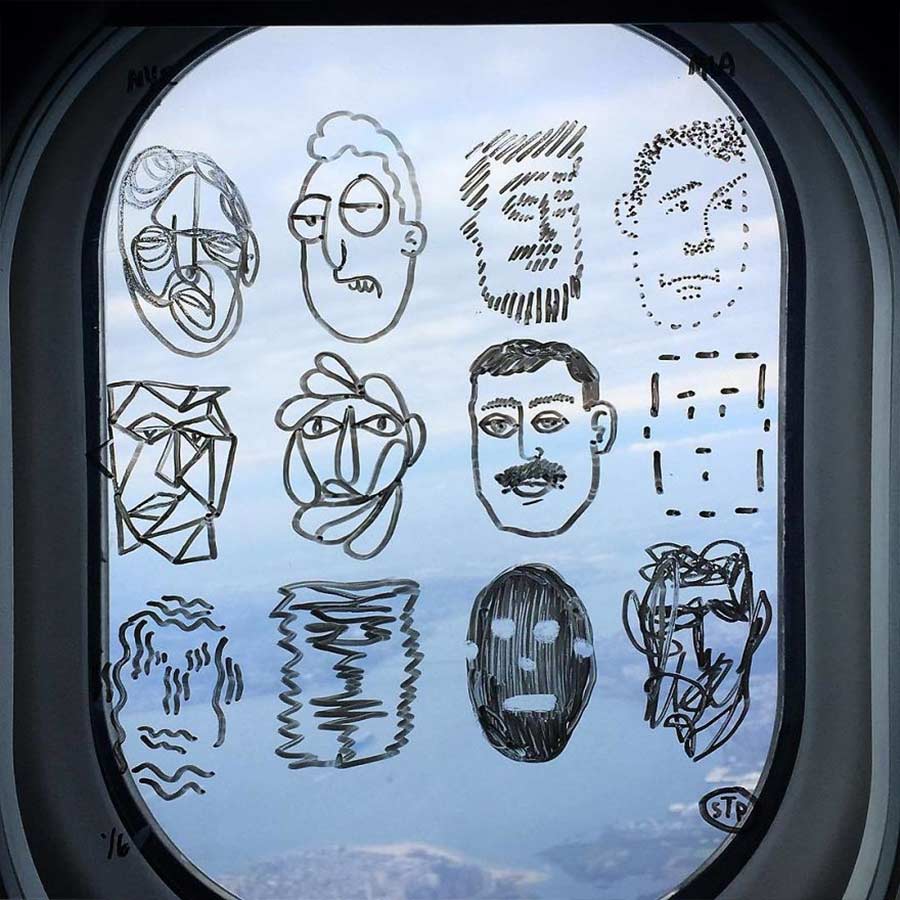 Wenn Stephen Palladino einen Fensterplatz im Flugzeug ergattern konnte, holt er den (vermutlich wasserlöslichen) Edding aus der Tasche und bemalt die Scheibe. Stets mit luftigen Motiven, die mit dem Flugzeugflügel oder dem Himmel spielen. So kann man die Flugzeug auch herum bekommen.