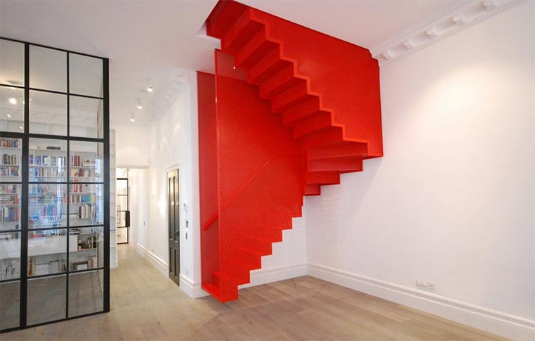 Würde ich ein LangweileDich.net-Hauptquartier bauen – diese Treppe hätte gute Chancen, ein Teil davon zu sein. Okay, die Farbe tut ihr Werk dazu, aber vor allem der eigentlich simple aber eben beeindruckende Fakt, dass sie scheinbar von der Decke schwebt, macht den Charme aus.