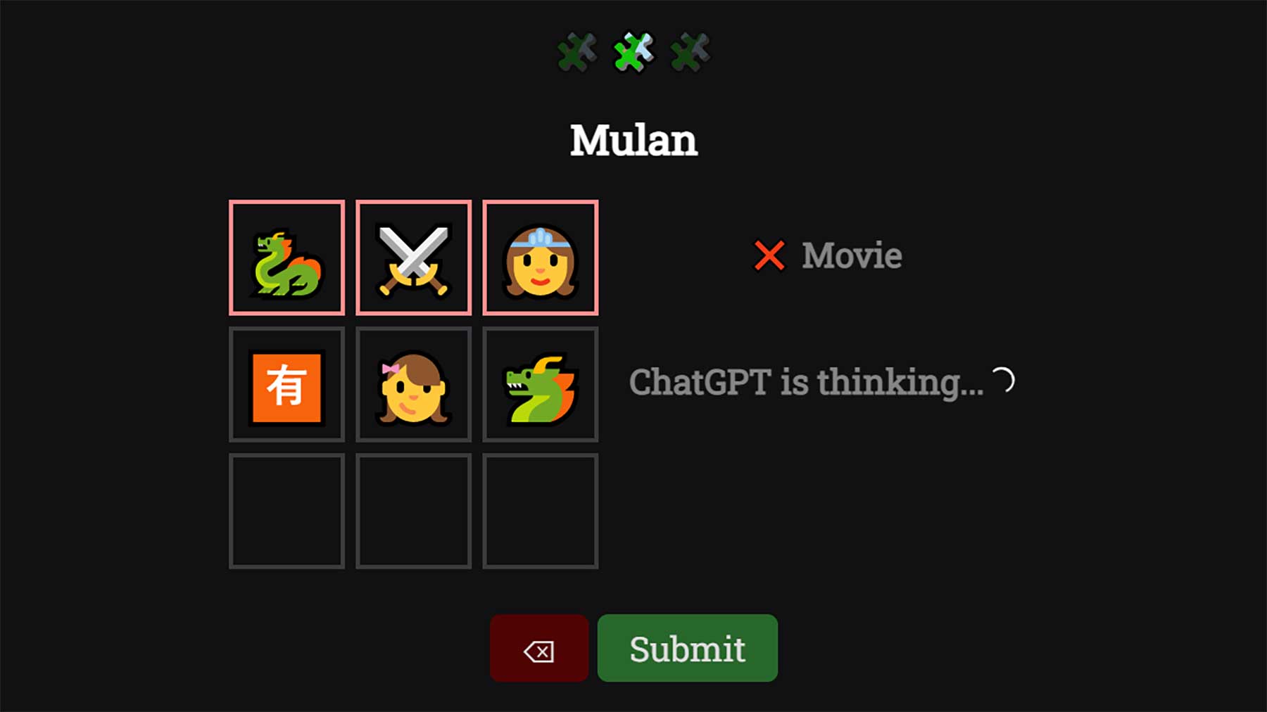 „PuzzleMoji“ ist ein nettes kleines Daily Game, das sich ChatGPT als Mitspieler geangelt hat. Der künstlichen Intelligenz gebt ihr drei Emojis vor, die einen vorgegebenen Filmtitel darstellen sollen, den es zu erraten gilt. Für jeden der drei täglich vorgegebenen Streifen habt ihr drei Versuche, als Team ans Ziel zu gelangen. Kurzweiliger Dreh des aktuellen KI-Hypes. Leider scheint es einige gängige Emojis nicht zur Auswahl zu geben, was das Vorhaben nochmal verkompliziert (ein „Thumbs up“ oder eine Flagge hätte ich gut gebrauchen können, aber auch so habe ich alle drei lösen können).