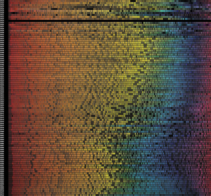 Vijay Pandurangan hat über 35.000 Filmplakatthumbnails analysiert und eine beachtliche Erkenntnis erhalten. Seit 1914 hat sich der Anteil an dunklen und blauen Farben tatsächlich stark erhöht. Ein Zeichen für die zunehmende Melancholie und Depression in der Welt?