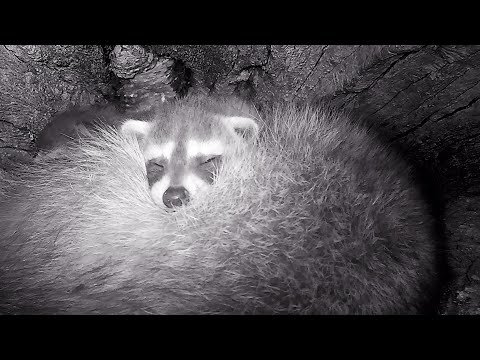 Wo wir gerade bei Waschbären sind (das ist eh immer gut!) – hier eine Waschbärenfamilie, die es sich in einem hohlen Baumstamm gemütlich macht: