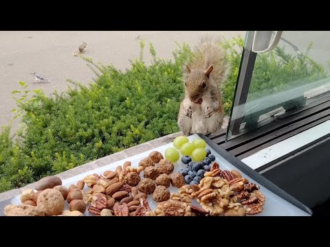 Kommen wir zur Rubrik „Essen mit Tieren“. Den Auftakt macht eine Eichhörnchen-Gang, die zum delikaten Sonntagsschmaus geladen wurde.