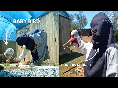 Auch Siya Nyawo vom FreeMe Wildlife Midlands Centre verkleidet sich, um einem Küken das Trinken beizubringen. Sachen gibt’s.