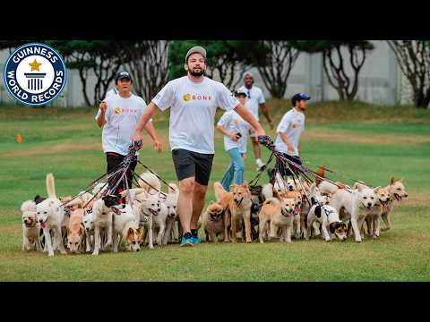 Fluffigen Ausgang hat dieser Kollege hier, der in Südkorea einfach mal mit 38 Hunden gleichzeitig Gassi gegangen ist – Weltrekord!