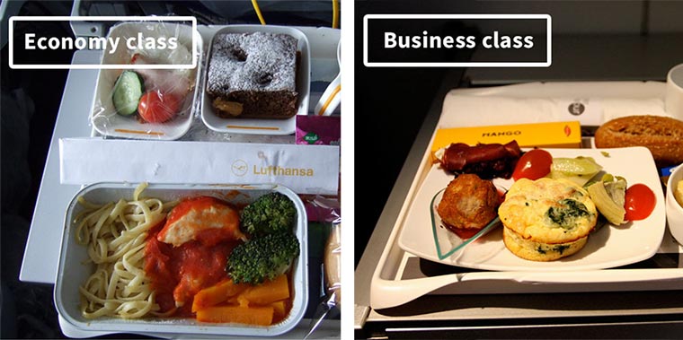 „Despite the name games, airline food hasn’t changed much. Economy class meals still come in a wrapper, and business or first-class meals come with real cutlery. This list shows the sometimes striking difference between what the different classes eat.“