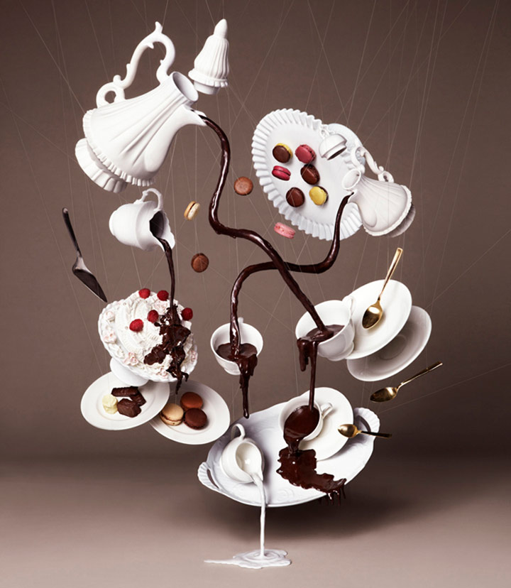 So durchgeführt vom japanischen Künstler-Kollektiv NAM. Das hat nämlich für den Harbour City Chocolate Trail (Hilfsaktion zugunsten der Einrichtung gegen Blutkrebs in Hong Kong) diese wundervollen Bilder geschossen, die Essen, Models und Mobilar schier schweben lässt. Und das in tatsächlich so bestehenden Szenerien. Ein Video am Ende des Beitrages beweist, dass es sich hierbei tatsächlich um echte Fotografien handelt.